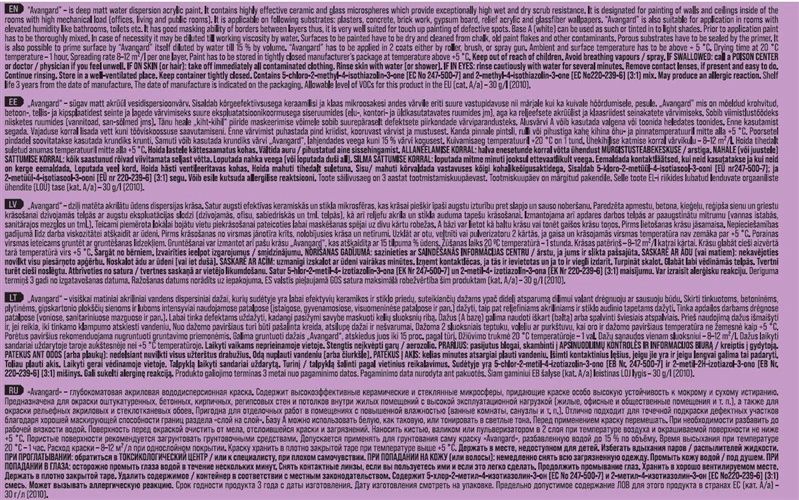 Zīmols- Pentacolor. Iepakojuma daudzums. l- 0.9. Krāsas tips- Emulsija. Krāsas tonis- Balta. Spīdums- Pilnīgi matēta. Izturība pret mitro tīrīšanu- 1. izturības klase. Atšķaidītājs- Ūdens. Apdares darbiem- Iekštelpu . Krāsas funkcija- Griesti. Patēriņš- 8-12 m²/l. Piemērotās virsmas- Betons. Ģipškartons. Ķieģeļu mūris. Darbarīki- Veltnis. Smidzināšanas uzgalis. Ota. Žūšanas laiks (pirms pieskaršanās)- 1 - 1h. Žāvēšanas laiks pirms apstrādes- 1 - 1h. Īpašības- Piemērots lietošanai mitrās telpās. ļoti piemērots krāsošanas defektiem. piemīt maskējošas īpašības.. Papildus informācija- Nav piemērots karstas iedarbības virsmām.