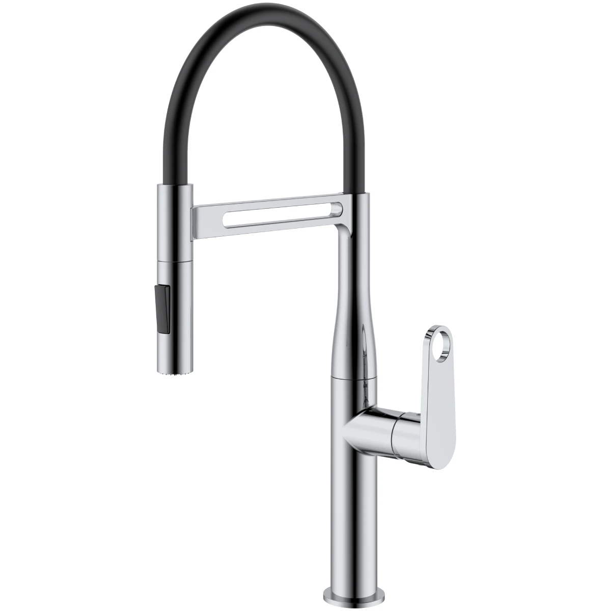 Virtuves jaucējkrāns AB CHLOE ar augstu, elastīgu snīpi un spīdīgu hromētu pārklājumu ir praktisks un dizainiski izteiksmīgs risinājums virtuvei. Grozāmais un lokāmais snīpis ļauj ērti noskalot traukus vai izlietni, kā arī nodrošina maksimālu kustību brīvību ikdienas darbos. Vienas sviras vadība nodrošina vienkāršu ūdens plūsmas un temperatūras regulēšanu. Hromētais korpuss apvienots ar kontrastējošu melnu šļūteni, kas piešķir krānam modernu un profesionālu izskatu. Pateicoties vienkāršai montāžai, tas ir piemērots gan mājas virtuvēm, gan restorānu vai bāru vajadzībām.