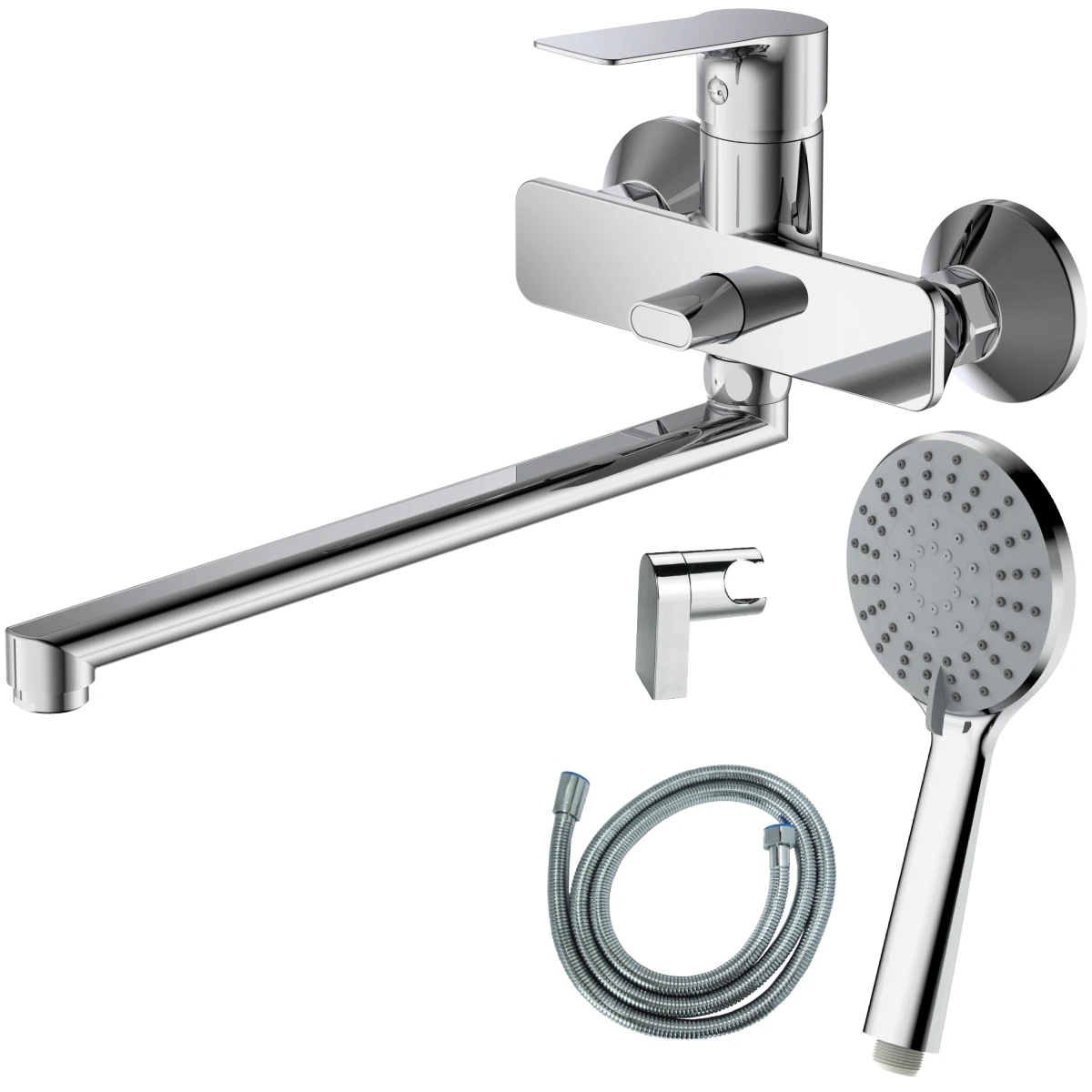 Jaucējkrāns vannai AB BRUCE GS ar dušas komplektu ir praktisks risinājums vannas istabām, kur nepieciešams ērti pārslēgties starp vannas un dušas funkciju. Tam ir garš grozāms snīpis, kas nodrošina papildu ērtību, īpaši kombinācijā ar izlietni. Vienas sviras vadība ļauj precīzi regulēt ūdens temperatūru un plūsmu, savukārt komplektā iekļautā dušas klausule, dušas pievads un sienas turētājs nodrošina pilnvērtīgu lietošanas pieredzi. Hromētais pārklājums piešķir elegantu izskatu un ir viegli kopjams, saglabājot spīdumu ilgtermiņā. Krāns paredzēts montāžai pie sienas.