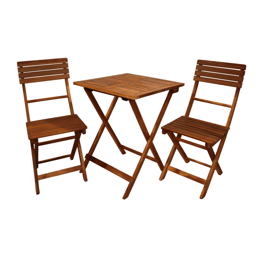 Dārza komplekts ar galdu un diviem krēsliem ir kompakts, saliekams un stilīgs risinājums āra atpūtai, kas apvieno praktiskumu ar dabisku estētiku. Gan galds, gan krēsli ir izgatavoti no izturīga koka, kas piešķir komplektam siltu, mājīgu izskatu un ļauj to harmoniski iekļaut dažādos balkona, terases vai dārza dizainos. Saliekamā konstrukcija nodrošina vieglu uzglabāšanu un pārvietošanu, padarot šo komplektu īpaši piemērotu arī mazākām telpām vai sezonālai lietošanai. Pateicoties stabilajai uzbūvei un metāla stiprinājumiem, kas nodrošina konstrukcijas drošību, komplekts būs uzticams gan ikdienas atpūtai, gan nelielām āra maltītēm. Tīrās formas un dabiskie materiāli piešķir tam klasisku šarmu, savukārt saliekamā funkcionalitāte sniedz papildu ērtības mūsdienīgai dzīves videi. Galda izmērs 58 × 58 × 75 cm, krēslu izmērs 38 × 53 × 88 cm.