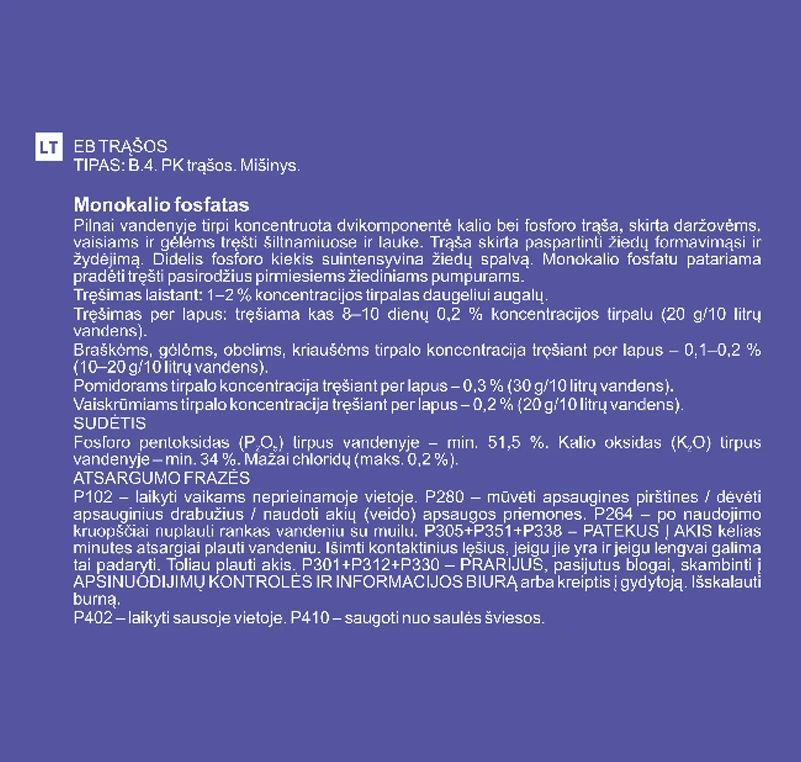 Zīmols- Garden Center. Svars- 1 kg. Mēslošanas līdzekļa veids- Pulveris. Paredzēts sezonai- Universāls. Sastāvs- Uz iepakojuma.. Uzmanību!- Uz iepakojuma esošo informāciju ir ieteicams saglabāt. Obligātā garantija- 24 mēn. Garantija juridiskām personām- 12 mēn. Papildus informācija- Monokālija fosfāta mēslojums. Pilnībā ūdenī šķīstošs, koncentrēts kālija un fosfora mēslojums, piemērots dārzeņu, augļu un ziedu mēslošanai siltumnīcās un ārā. Mēslojums ir paredzēts, lai paātrinātu ziedu veidošanos un ziedēšanu. Augstais fosfora saturs pastiprina ziedu krāsu. Ieteicams sākt mēslošanu ar monokalcija fosfātu, kad parādās pirmie ziedpumpuri. Lietošana un devas: apūdeņošanai: 1-2% šķīdums lielākajai daļai augu.Mēslošanai uz lapām: ik pēc 8-10 dienām ar 0,2% šķīdumu (20g/10l ūdens). Zemenēm, puķēm, ābelēm, bumbierēm - lapotnē 0,1-0,2% koncentrācijā (10-20g/10l ūdens). Tomātiem - lapotnē 0,3 % koncentrācijā (30 g/10 l ūdens). Krūmiem - 0,2 % (20 g/10 l ūdens) lapotnē..