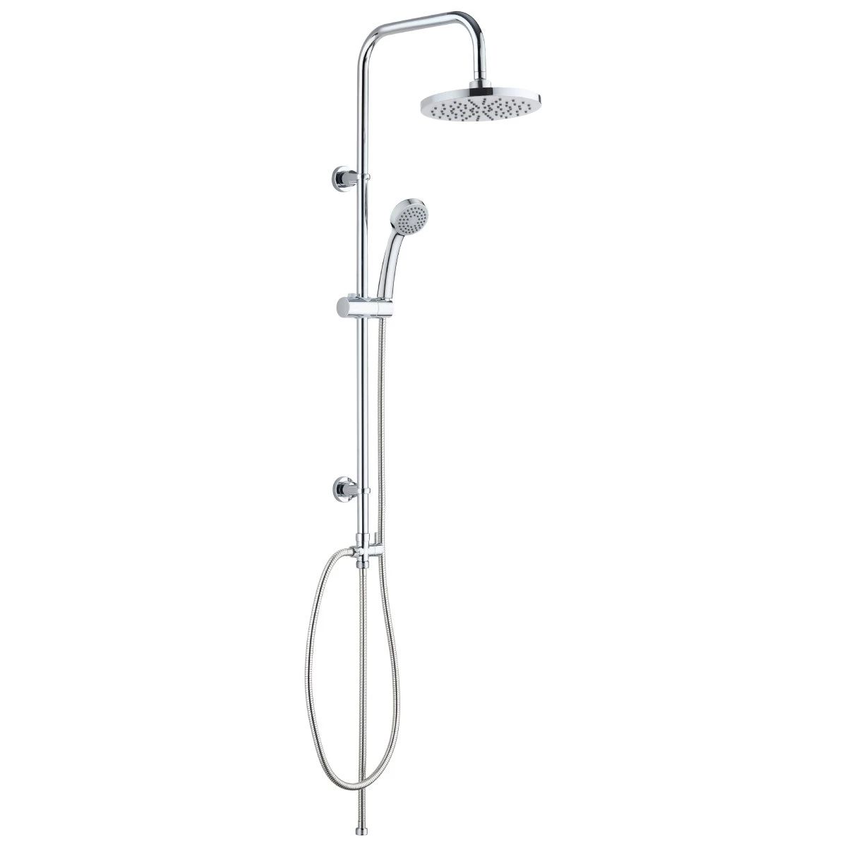 AB dušas kolonna hromētā krāsā bez maisītāja nodrošina elegantu un funkcionālu dušas risinājumu ar diviem dušas veidiem. Šī kvalitatīvā dušas kolonna ietver gan lielu lietusdušu, gan rokas dušu ar regulējamu turētāju, kas nodrošina universālas dušas iespējas visiem ģimenes locekļiem. Hromētais pārklājums piešķir komplektam spīdīgu un ilgmūžīgu virsmu, kas labi sader ar dažādiem vannas istabu stiliem un nodrošina vieglu kopšanu. Rokas dušas turētāju var regulēt leņķī un augstumā, kas ļauj katram lietotājam atrast optimālo pozīciju. Komplekts ir bez maisītāja, tāpēc nepieciešams atsevišķs ūdens temperatūras regulēšanas risinājums. Kolonnas kopējais augstums 95 cm, lietusdušas diametrs 20 cm, rokas dušas galvas diametrs 7.8 cm, dušas pievada garums 150 cm, pievada garums līdz maisītājam 60 cm.