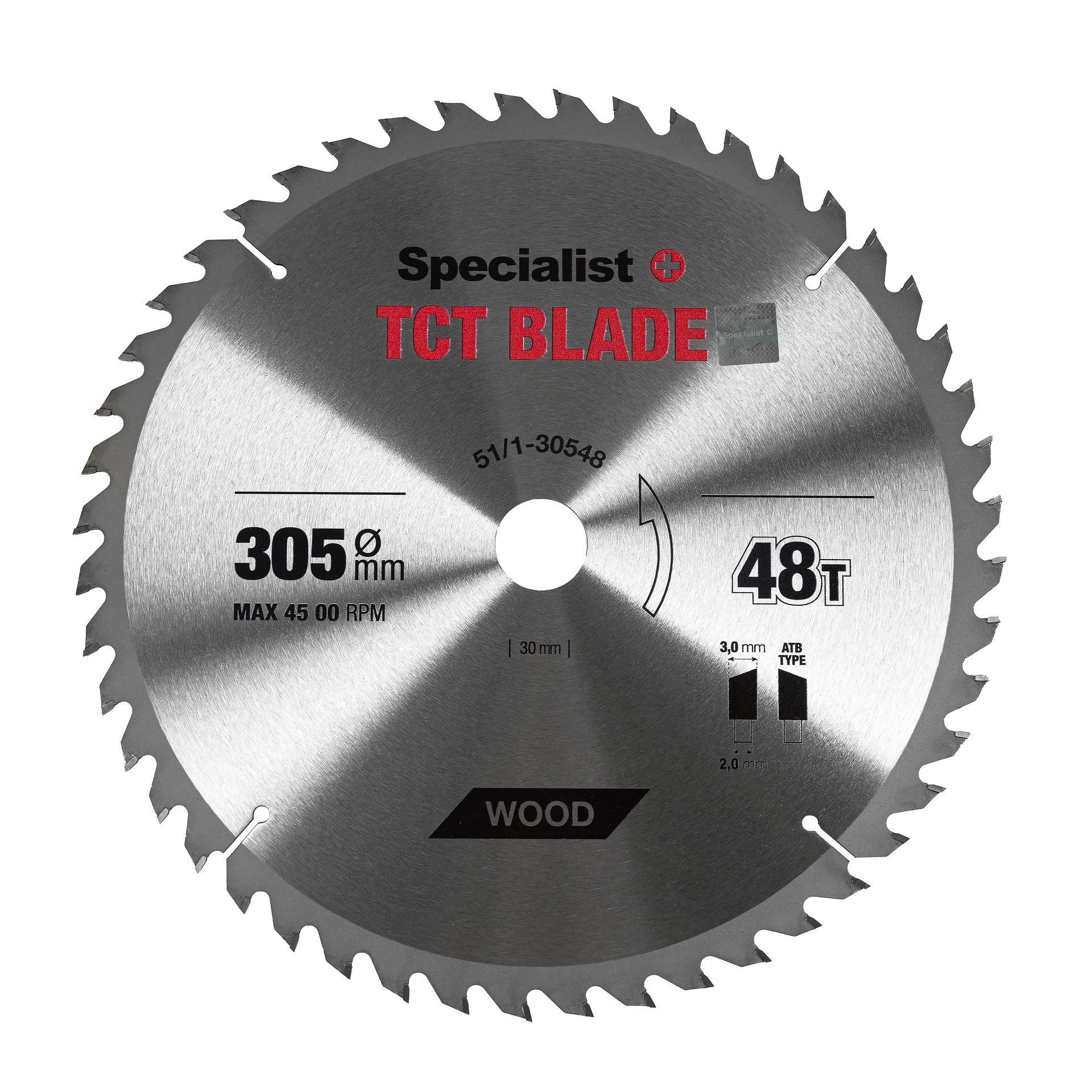 Ražotājs: Specialist+ | Diska diametrs, mm: 305 | Griezuma biezums, mm: 3,0 | Disku biezums, mm: 2,0 | Zobu skaits: 48 | Diska iekšējais diametrs: 30 | Zāģa asmens zobu tips: ATB | Griezuma veids: Šķērsgriezums