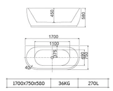 Zīmols- Masterjero. Modelis- 3807. Vannas tips- Brīvi novietots. Materiāls- Akrila. Garums- 170 cm. Platums- 75 cm. Augstums- 58 cm. Forma- Ovāla. Krāsa- Balta. Svars- 36 kg. Noplūdes caurums- Jā. Komplekts- Vanna, vannas kājas. Obligātā garantija- 24 mēn. Sifons komplektā- Jā. Panelis komplektā- Nē. Ar kājiņām- Jā.
