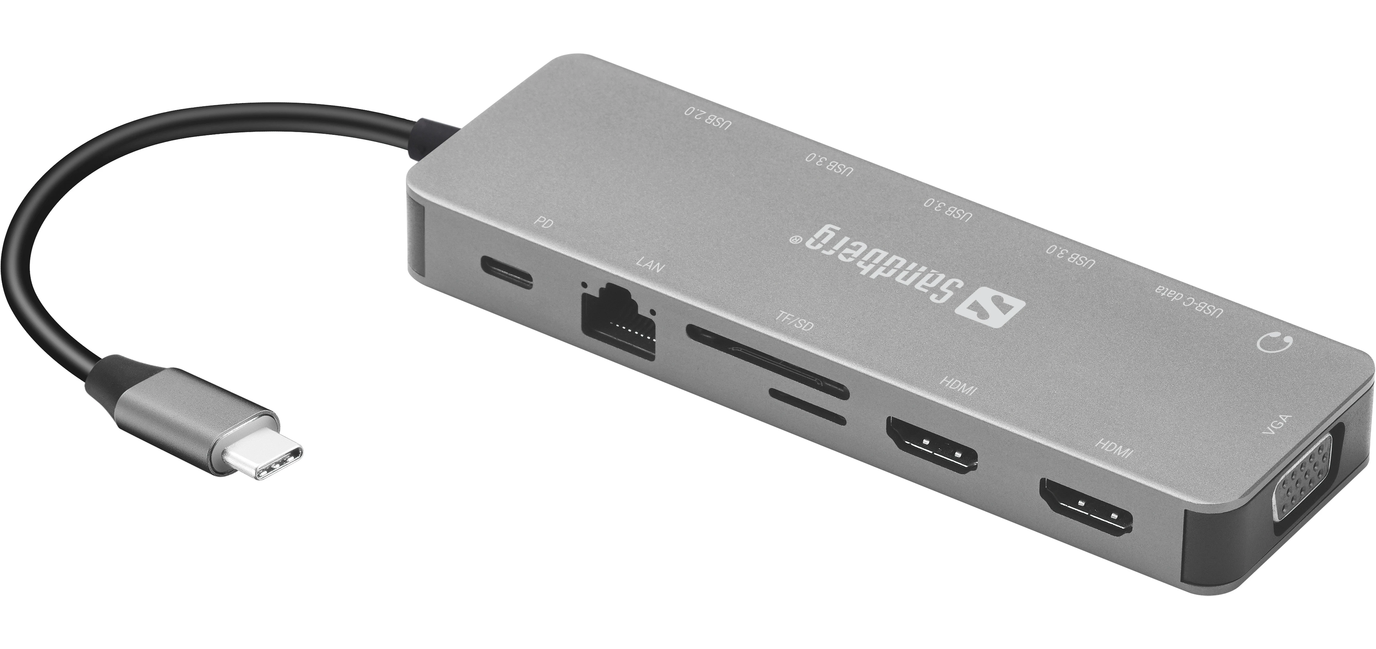 Tikai ar vienu USB-C savienojumu ar klēpjdatoru, Sandberg USB-C 13-vienā Travel Dock sniedz iespēju pievienot visu aprīkojumu: