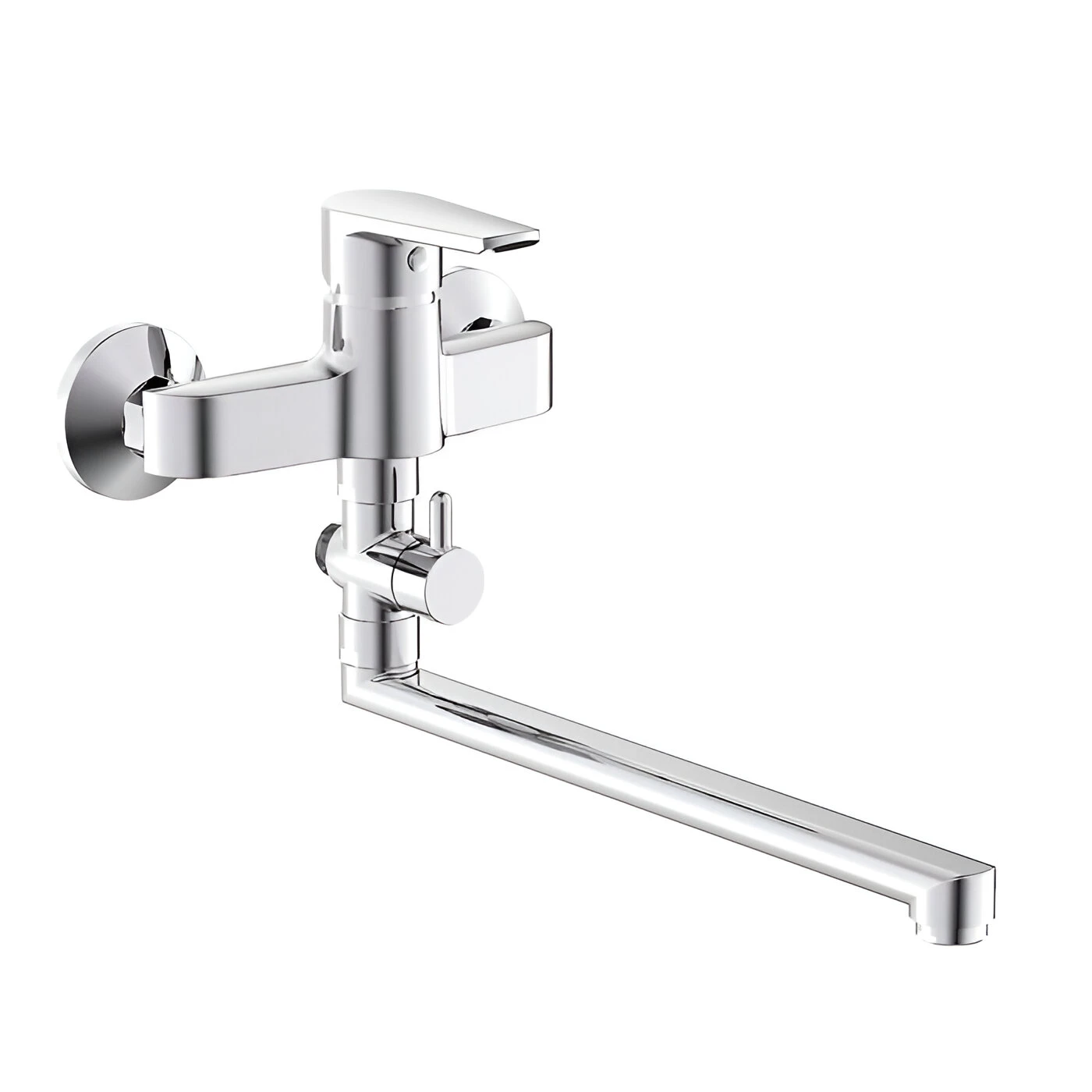 Garais dušas maisītājs izgatavots no augstas kvalitātes hromēta misiņa, aprīkots ar grozāmu 32.3 cm garu izteku, sānu vannas / dušas slēdzi un sānu atzaru dušas šļūtenes pievienošanai diametram no 1/2. Modelis ir uzstādīts uz diviem caurumiem, izmantojot ekscentrisku savienojumu ar diametru 1/2. Keramikas kārtridžs.
