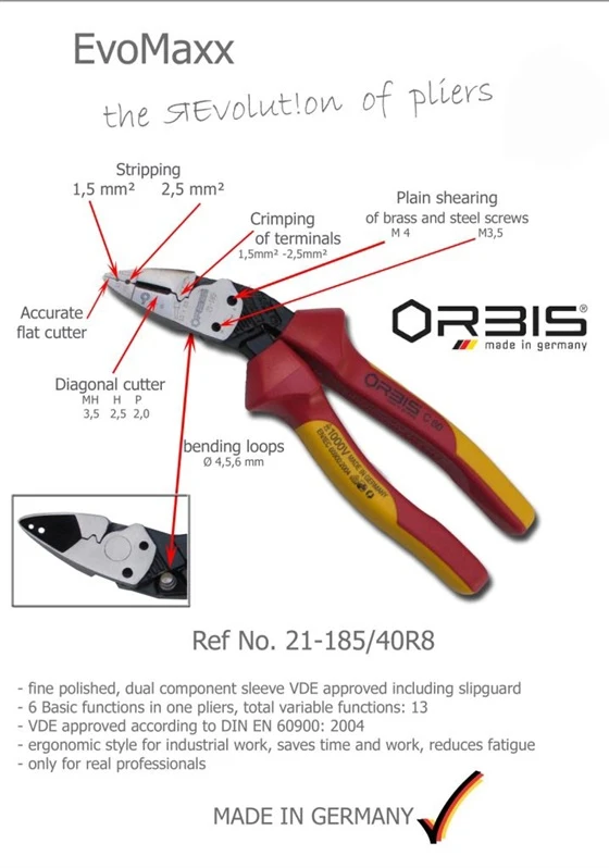 Prekės ženklas- Orbis. Artikulas- 21-1850/40RV. Ilgis- 185 mm. Svoris- 0.272 kg. Medžiaga- Plastikas. Plienas. Tinka elektros darbams iki - 1000 V. DIN ISO standartas- DIN ISO 5743. Papildoma informacija- Svoris: 0.272 kg. Tinka elektros darbams iki: 1000 V. DIN ISO standartai: DIN ISO 5743.