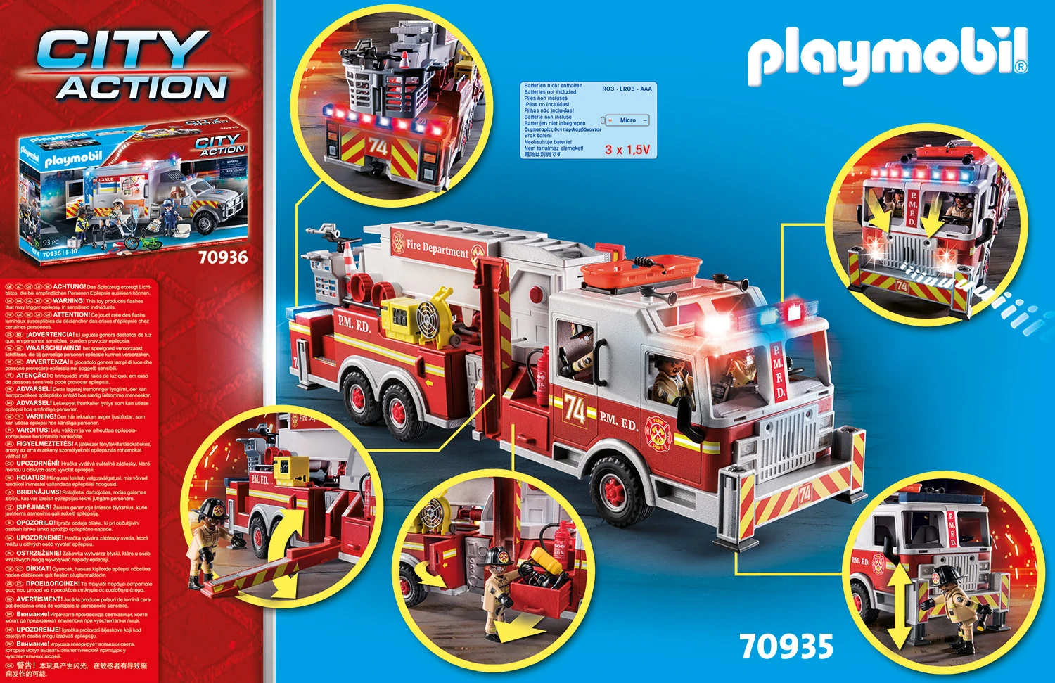 Niekas neatvyksta taip greitai, kaip PLAYMOBIL ugniagesių komanda. Su savo puikiu, visomis priemonėmis ir moderniausia technika aprūpintu automobiliu ugniagesiai visada pasiruošę užgesinti gaisrą ir išgelbėti patekusius į bėdą. Automobilis turi originalų JAV ugniagesių sirenos garsą, šviesas ir veikiančią vandens patranką! (Reikalingos 3 x 1,5 V mikrobaterijos). Matmenys: 53 x 14 x 16 cm.