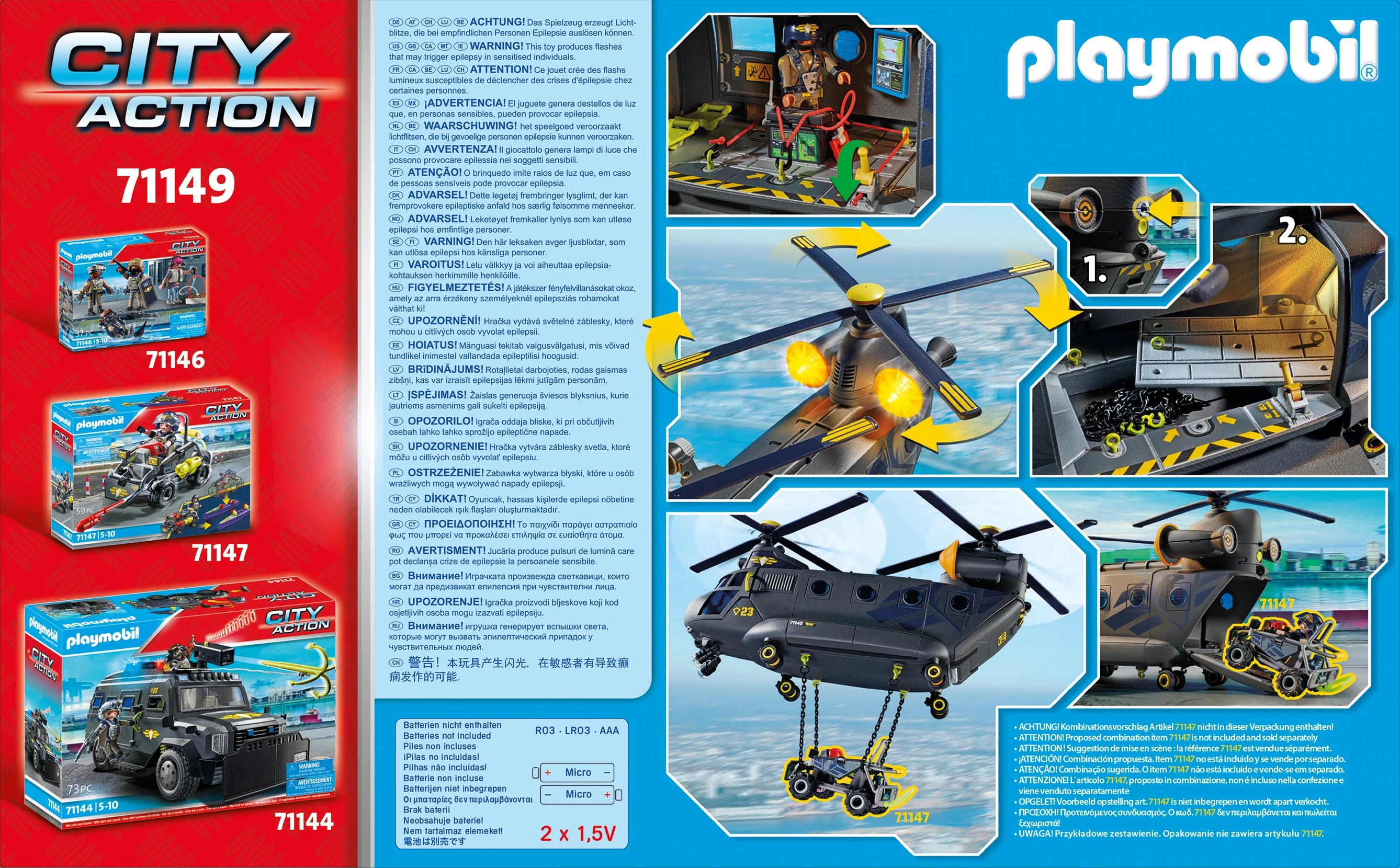 Specialiųjų pajėgų lėktuvas su šviesomis ir garsais, dviem PLAYMOBIL figūrėlėmis ir šaunia policijos įranga smagioms ir veiksmo pilnoms misijoms. Su šiuo lėktuvu net sudėtingiausios misijos ore tampa lengvai įveikiamos. Lėktuvo kabinoje telpa dvi figūrėlės ir dar dvi – lėktuvo krovinių skyriuje, atlenkus sėdynes. Integruotas šviesų ir garsų modulis yra valdomas lėktuvo propelerių judesių. Skraidinant ypatingus krovinius, juos galima prisegti specialiais diržais, o jei visi kroviniai netelpa į lėktuvo vidų, juos galima pritvirtinti ant grandinių lėktuvo apačioje. Gelbėtojų lėktuvą galima atidaryti iš visų keturių pusių. Į šį lėktuvą telpa specialiųjų pajėgų keturratis (71147 – parduodamas atskirai). PLAYMOBIL rinkiniai iš serijos „City Action“ – tai daugybė veiksmo ir jaudinančių žaidimų. Jie puikiai tiks nuotykius mėgstantiems vaikams.