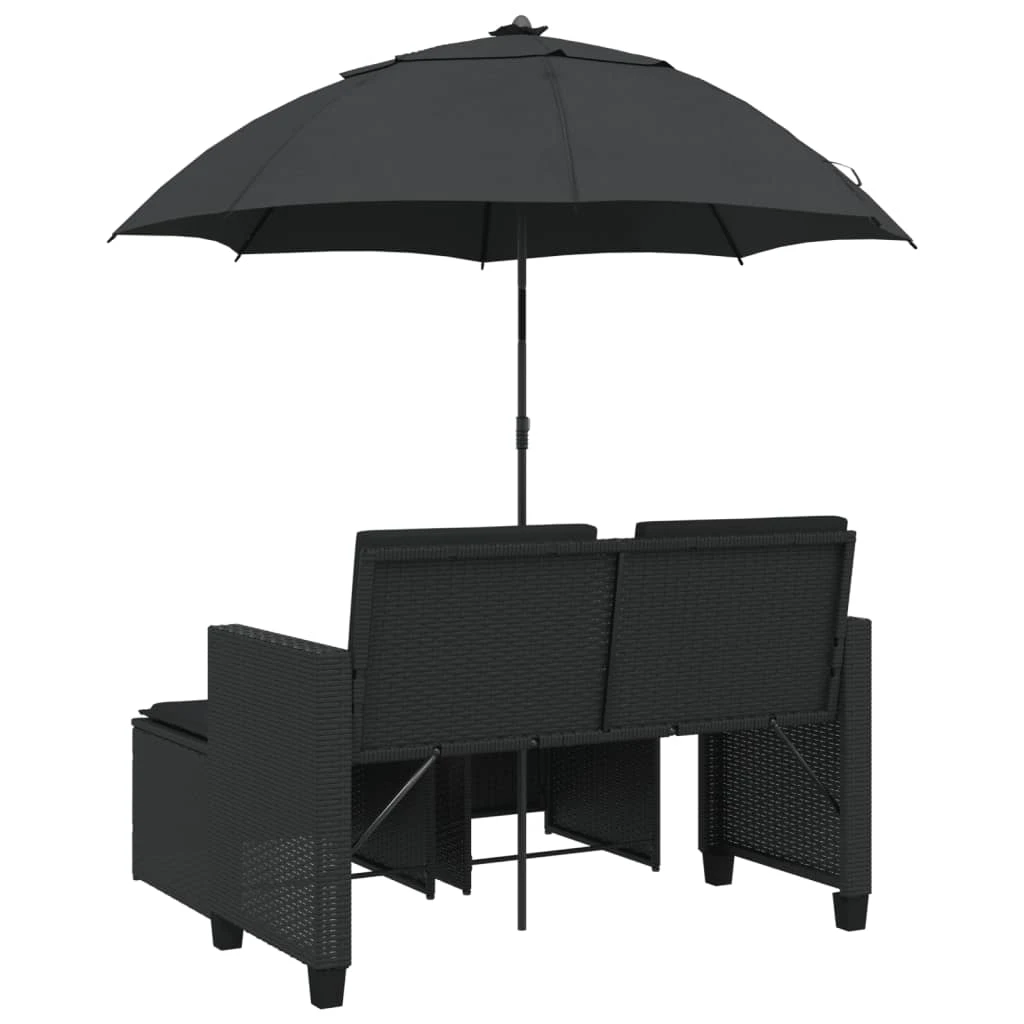 vidaXL Dvivietė sodo sofa su skėčiu-taburetėmis, juoda, poliratanas
