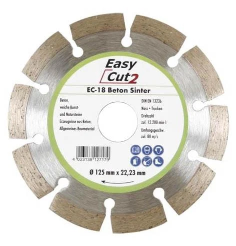 Prekės ženklas- Cedima. Artikulas- EC-18.1. Skersmuo- 115 mm. Vidinės skylės skersmuo- 22.23 mm. Storis- 1.9 mm. Deimantinio disko tipas- Segmentinis. Apdirbama medžiaga- Akmuo. Betonas. Klinkeris. Tinka pjovimui- Sausam. Šlapiam. Vienetai pakuotėje- 1. Maksimalus sūkių dažnis per minutę- 12200 rpm. Pjovimo greitis- 80 m/s. Tinka įrankiams- Kampiniams šlifuokliams.