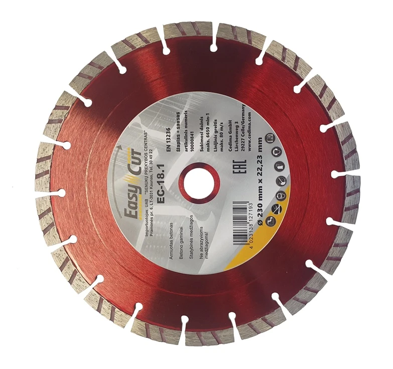 Prekės ženklas- Cedima. Artikulas- EC-18.1. Skersmuo- 180 mm. Vidinės skylės skersmuo- 22.23 mm. Storis- 2.2 mm. Deimantinio disko tipas- Segmentinis. Apdirbama medžiaga- Akmuo. Betonas. Klinkeris. Tinka pjovimui- Sausam. Šlapiam. Vienetai pakuotėje- 1. Maksimalus sūkių dažnis per minutę- 12200 rpm. Pjovimo greitis- 80 m/s. Garantija- 24 mėn. Tinka įrankiams- Kampiniams šlifuokliams. Papildoma informacija- Tinka pjauti: sausai. drėgnai. Deimantinio disko tipas: segmentas. Maksimalus greitis per minutę: 12200 aps./min. Pjovimo greitis: 80m/s.