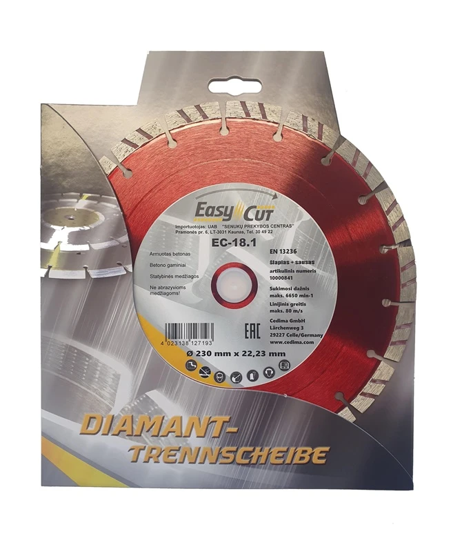 Prekės ženklas- Cedima. Artikulas- EC-18.1. Skersmuo- 230 mm. Vidinės skylės skersmuo- 22.23 mm. Storis- 2.4 mm. Deimantinio disko tipas- Segmentinis. Apdirbama medžiaga- Akmuo. Betonas. Klinkeris. Tinka pjovimui- Sausam. Šlapiam. Vienetai pakuotėje- 1. Maksimalus sūkių dažnis per minutę- 6650 rpm. Pjovimo greitis- 80 m/s. Garantija- 24 mėn. Tinka įrankiams- Kampiniams šlifuokliams.