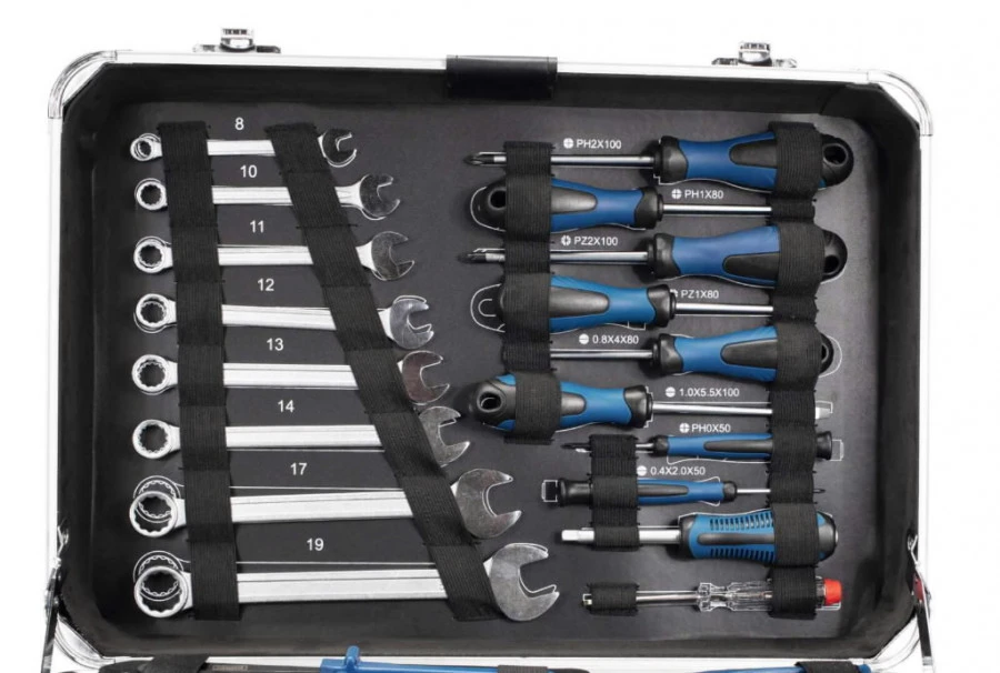 sukimo galvos, prailgintuvai, plaktukas, 5 m ruletė, peilis, rankinis pjūklas, kombinuoti veržliarakčiai, atsuktuvai, įtampos indikatorius.