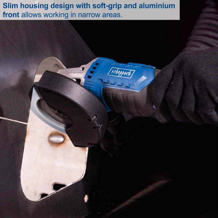 Darbas be laido su „Scheppach IXES“ 20 voltų serija – visi šios sistemos akumuliatoriai ir įkrovikliai yra suderinami su kampiniu šlifuokliu