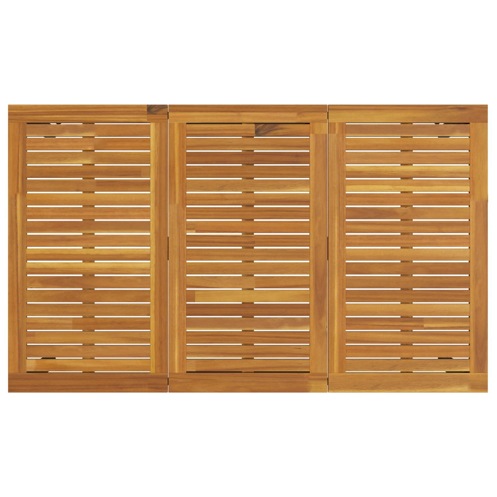 - Patvarios medžiagos: Pagamintas iš aukščiausios kokybės kietos akacijos medienos, žinomos dėl savo turtingos rudos spalvos ir natūralaus atsparumo orui, tad puikiai tinka lauko naudojimui. Plieninės dalys suteikia tvirtumo ir stabilumo, užtikrinančio, kad rinkinys tarnaus ilgai be stiliaus praradimo.