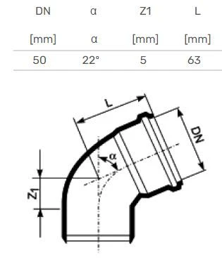 Vidaus kanalizacijos alkūnė HTplus. DIA 50 mm. 22°