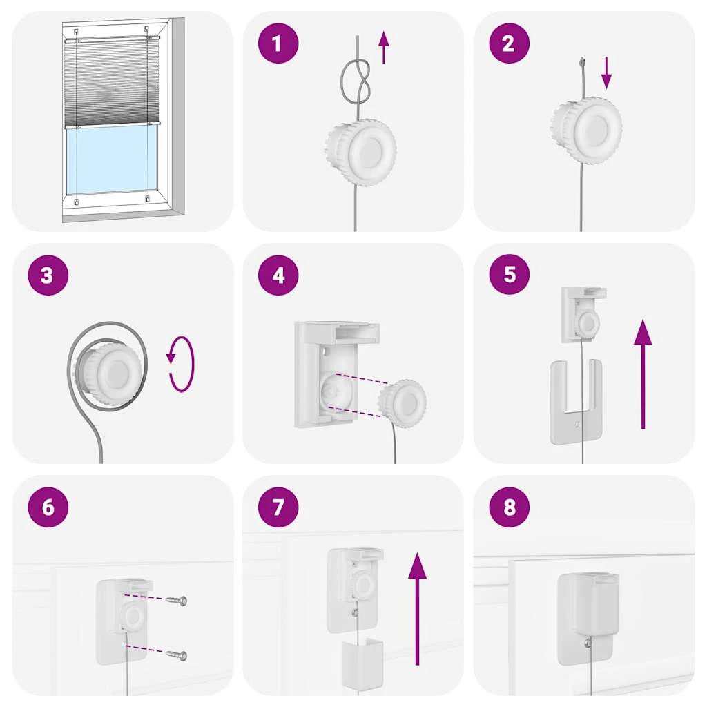 - Du surinkimo būdai: Plisuotą žaliuzę galite pritvirtinti prie sienos arba lango varžtais arba be gręžimo, naudodami tvirtinimo kronšteinus, priklausomai nuo jūsų poreikių.