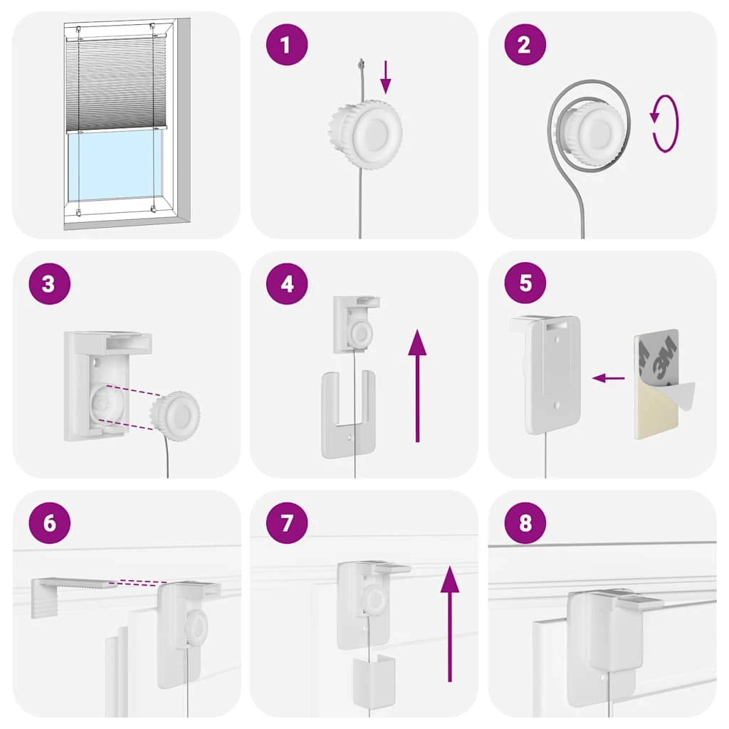 - Du surinkimo būdai: Plisuotą žaliuzę galite pritvirtinti prie sienos arba lango varžtais arba be gręžimo, naudodami tvirtinimo kronšteinus, priklausomai nuo jūsų poreikių.