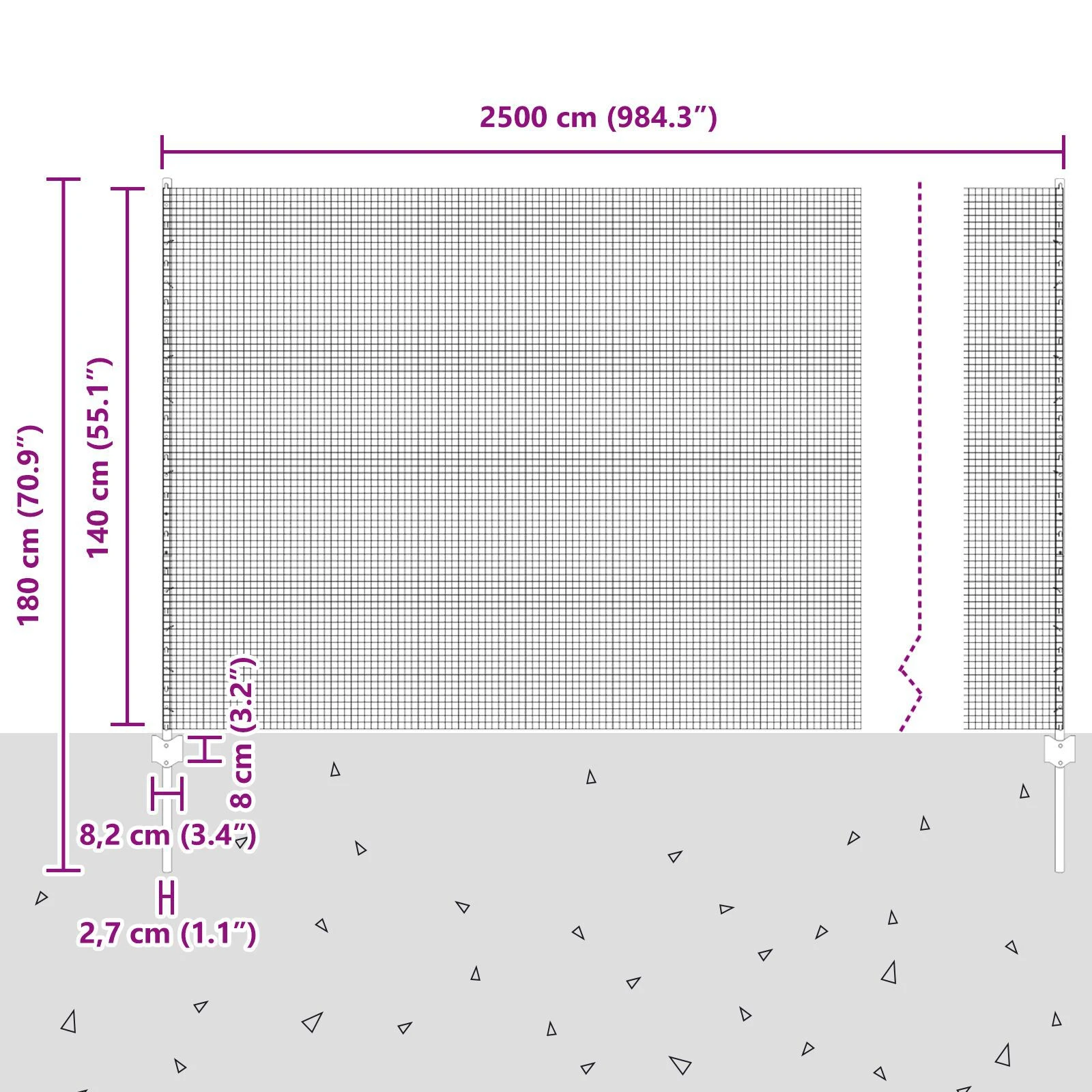 - Bendri matmenys: 2500 x 2,7 x 140 cm (I x P x A)