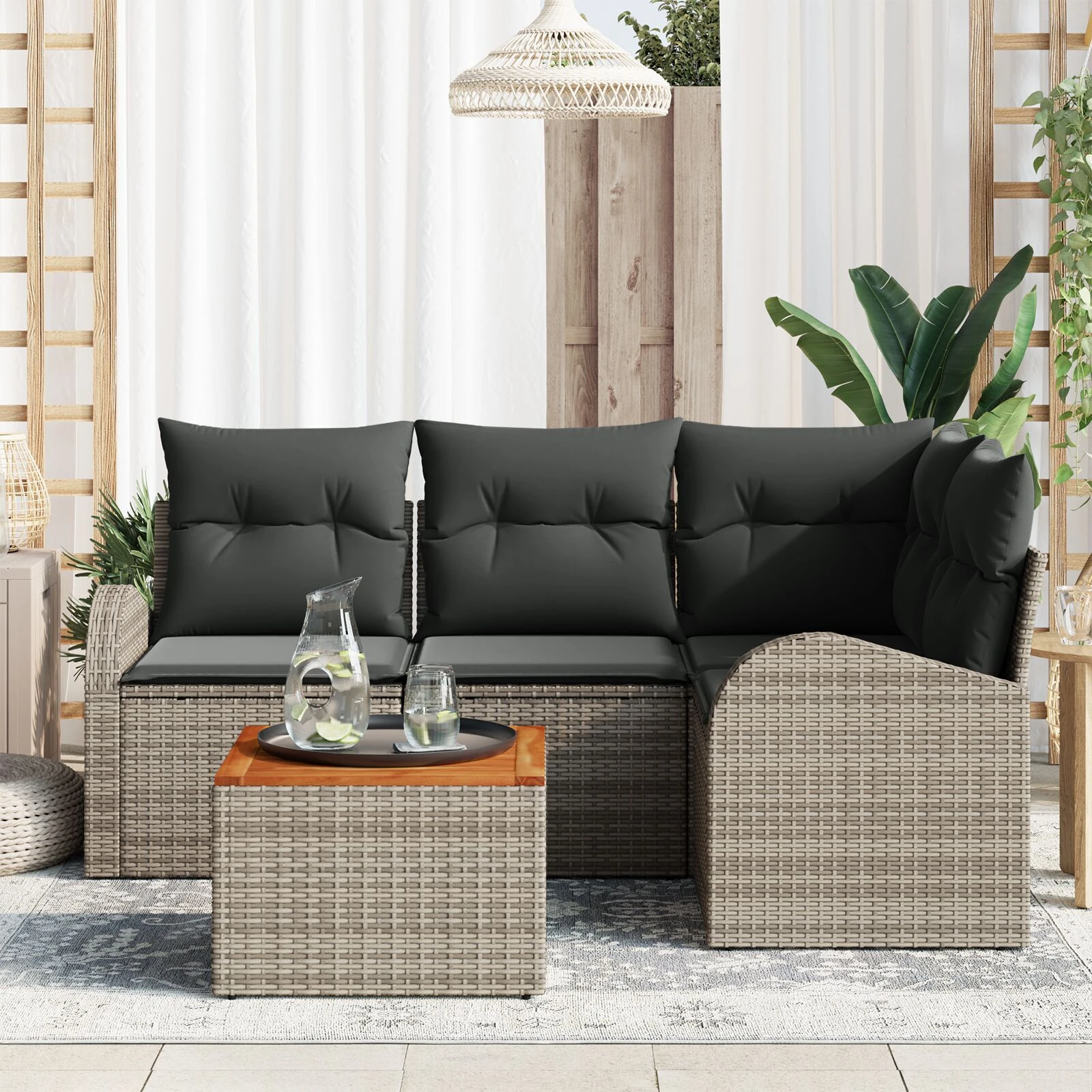 Modulinis sodo sofos komplektas yra modernus sprendimas, idealiai tinkantis bet kokiai lauko erdvei. Su paprastu, bet funkcionaliu dizainu, šis komplektas pasižymi švariomis linijomis ir minimalizmu, todėl puikiai tinka poilsiui ir socializacijai. Ar jūs puošiate terasą, sodą ar balkoną, jo estetika lengvai dera su įvairiais lauko dekoracijų elementais, todėl jis yra idealiai tinka maloniam laikui su šeima ar draugais. Šis komplektas dėl komforto ir praktiškumo buvo sukurtas su elegantišku sėdėjimu ir patogiu paviršiumi.