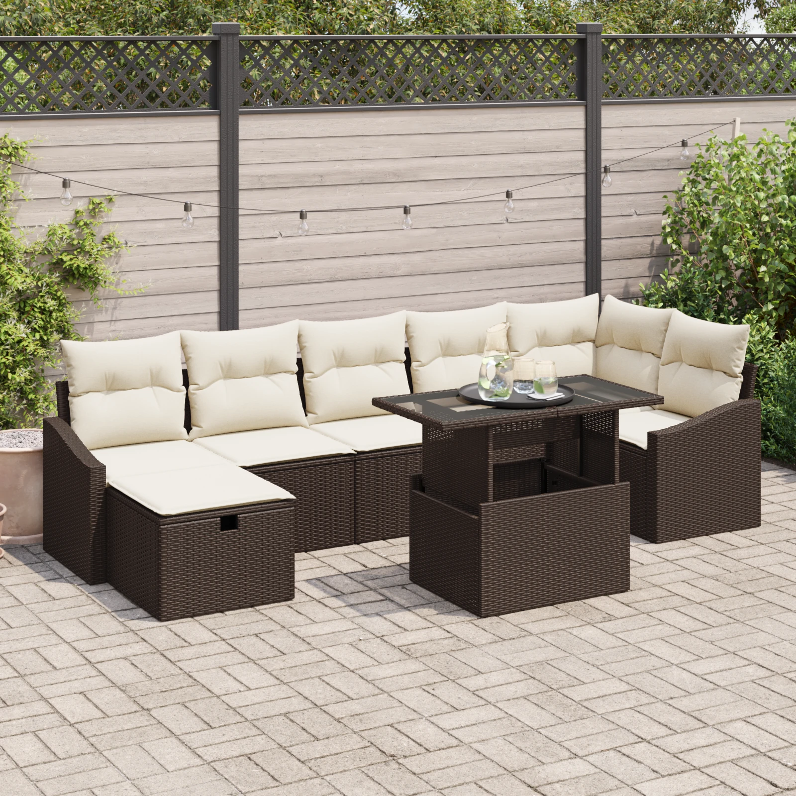 - Perkonfigūruojami saugojimo skyreliai: Modulinis dizainas leidžia lengvai pertvarkyti ir pritaikyti komplektą pagal savo erdvę ir žmonių skaičių. Kiekvienas modulis turi patogią sėdimą vietą ir integruotą saugojimo skyrių, idealiai tinka pagalvėlėms ar mažiems daiktams, todėl lauko gyvenimas tampa funkcionalesnis ir organizuotas.
