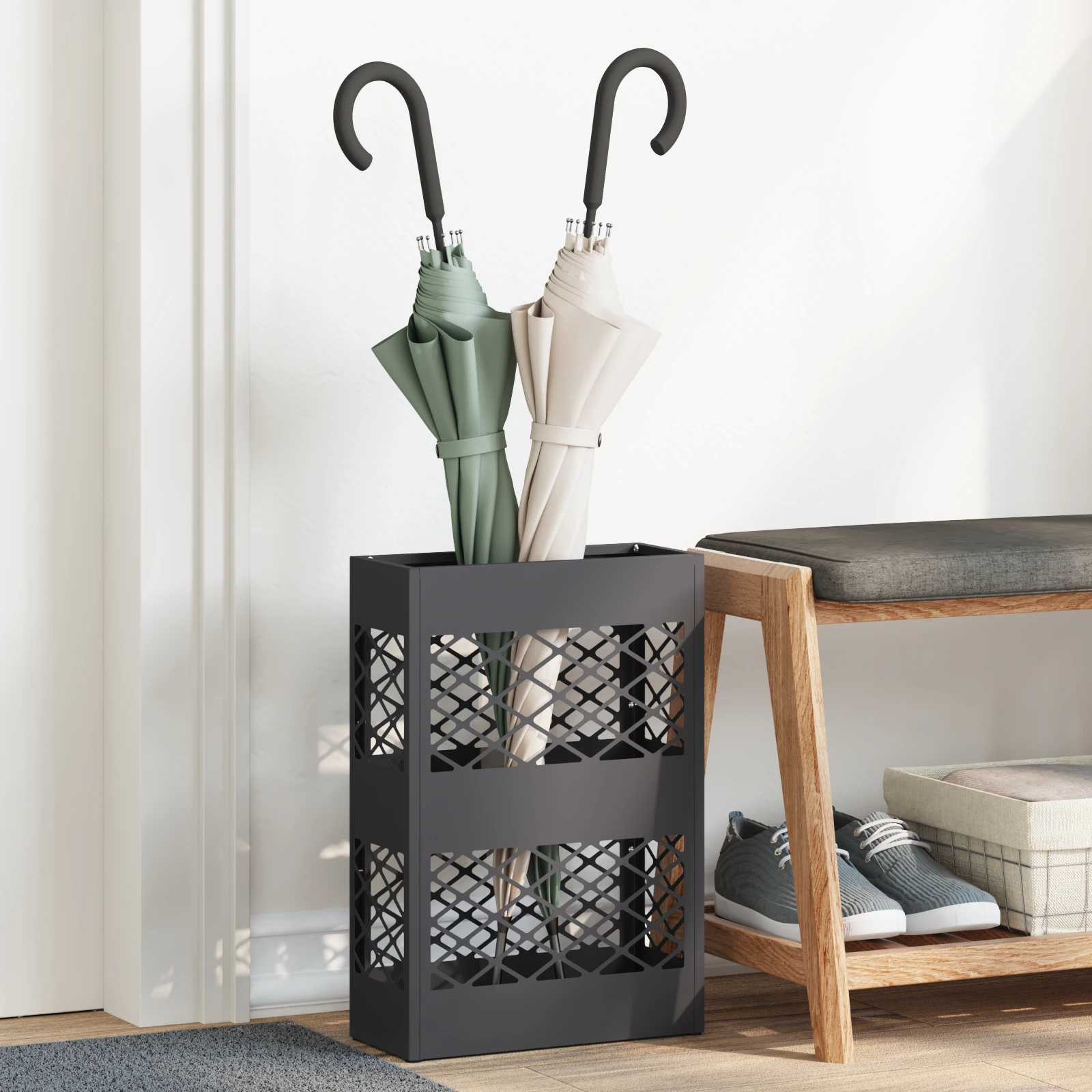 - Savybės/Funkcija/Dizainas: Jame yra pakankamai vietos keliems skėčiams ir kitiems daiktams, tai praktiškas sprendimas užimtotam namų ūkiui, užtikrinantis greitą prieigą.