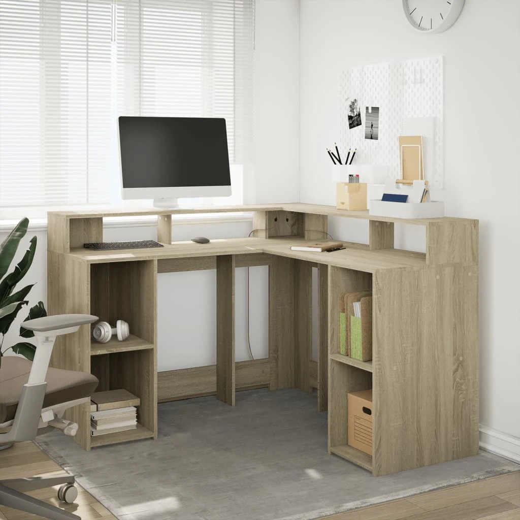 vidaXL Rašomasis stalas su LED apšvietimu, ąžuolo, 130x130x91cm