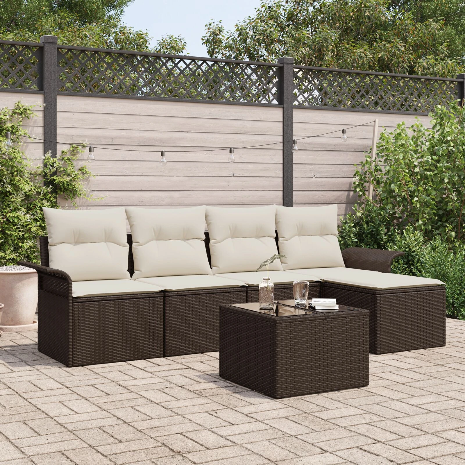 - Premium poli rataninė medžiaga: Ši modernaus dizaino sofa pagaminta iš kokybiškos poli rataninės, žinomos dėl ilgaamžiškumo ir gebėjimo atlaikyti UV spindulius, nesunaikinus. Audinių struktūra suteikia stilingumo, o atsparumas blogam orui užtikrina, kad sofa išliks graži visus metus.