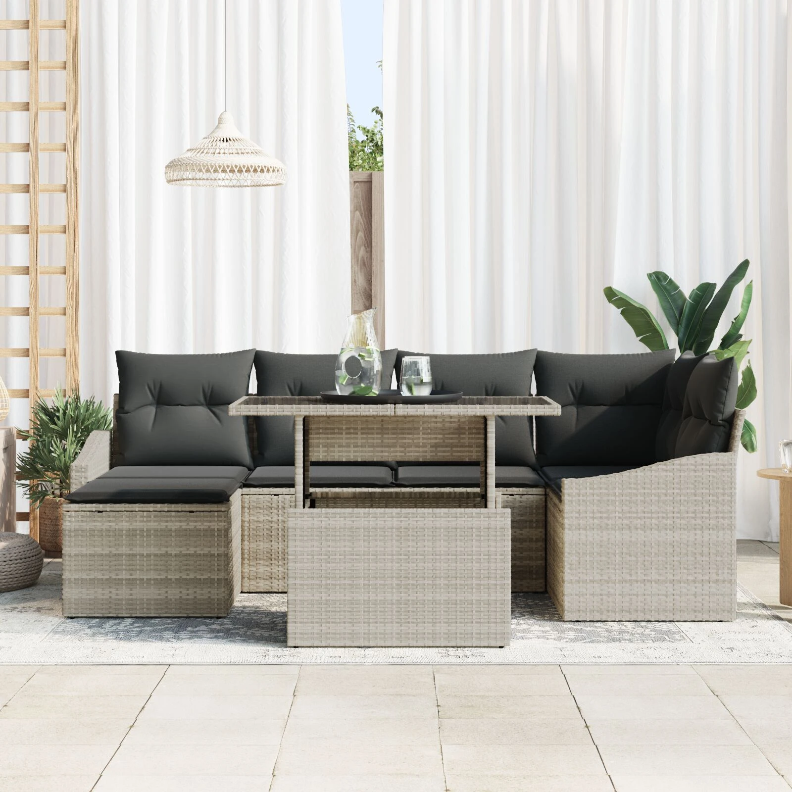 - Ypatybės / funkcijos / dizainas: Atsparus UV spinduliams ir oro sąlygoms, šis rinkinys atlaiko lauko sąlygas neprarasdamas dalies stiliaus. Jo modulinis dizainas leidžia pritaikyti išdėstymą pagal jūsų poreikius.