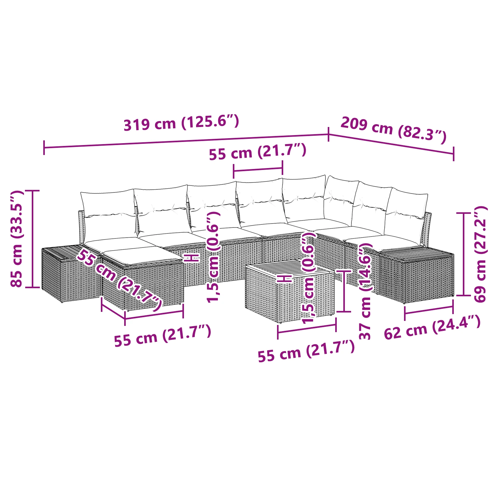Šis Polirataninės sodo sofos komplektas yra jūsų ideali kompanija, norint išlaikyti stilingą ir funkcinę lauko erdvę. Sujungiant šiuolaikinę estetiką su moduline lankstomumu, jis atitinka įvairius lauko scenarijus - šeimos susibūrimui, neformaliam BBQ, arba ramiam poilsiui sode. Su pintu paviršiaus tekstūru ir švariais, moderniais linijomis, šis rinkinys idealiai tinka šiuolaikinėms lauko aplinkoms.