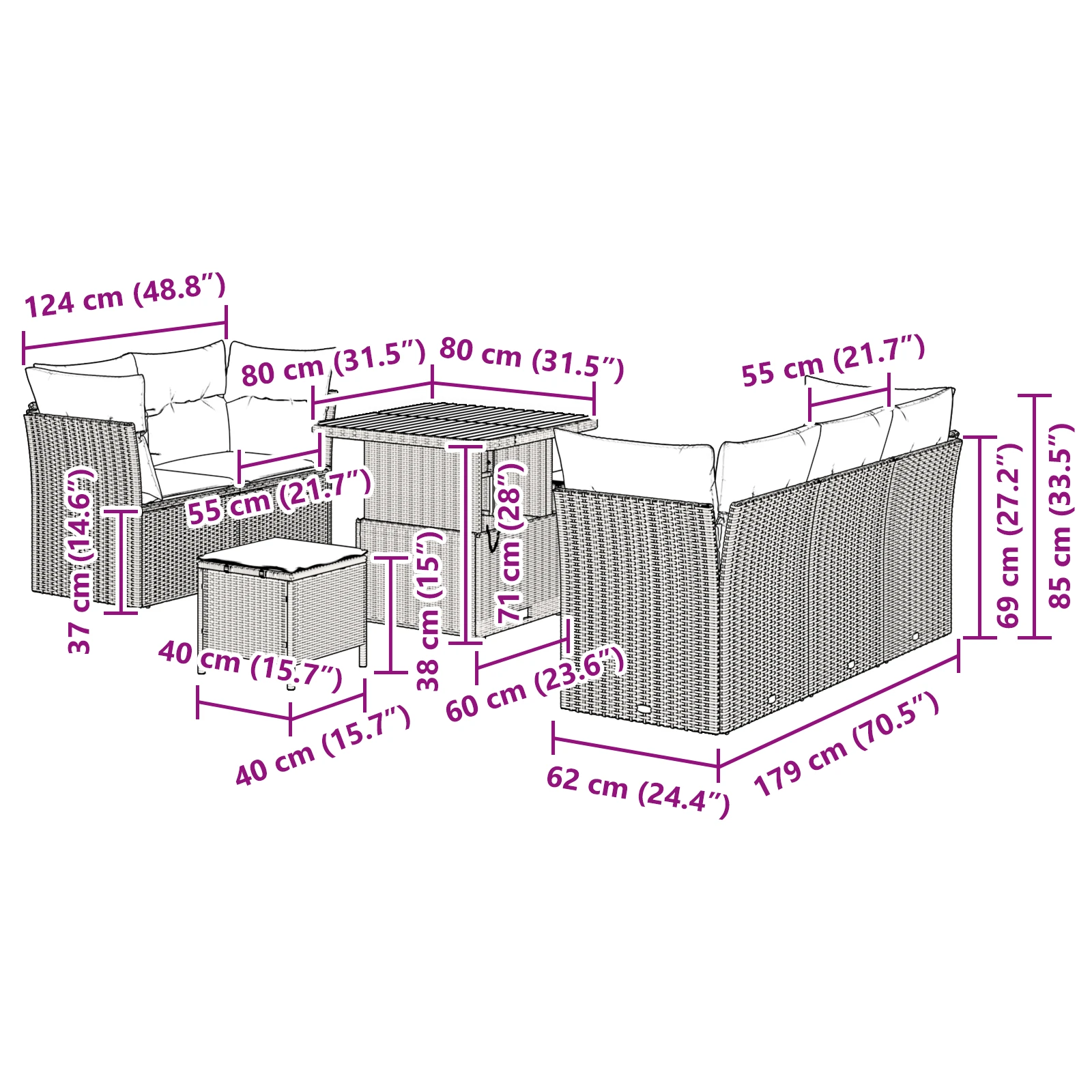- Rekomenduojami naudojimai: Puikiai tinka valgymui ir poilsiui lauko terasose arba kiemeliuose, šis komplektas pritaikomas bet kokiems poreikiams. Jo modulinis dizainas leidžia lengvai pritaikyti išdėstymą intymiems susibūrimams arba didesniems vakarėliams.