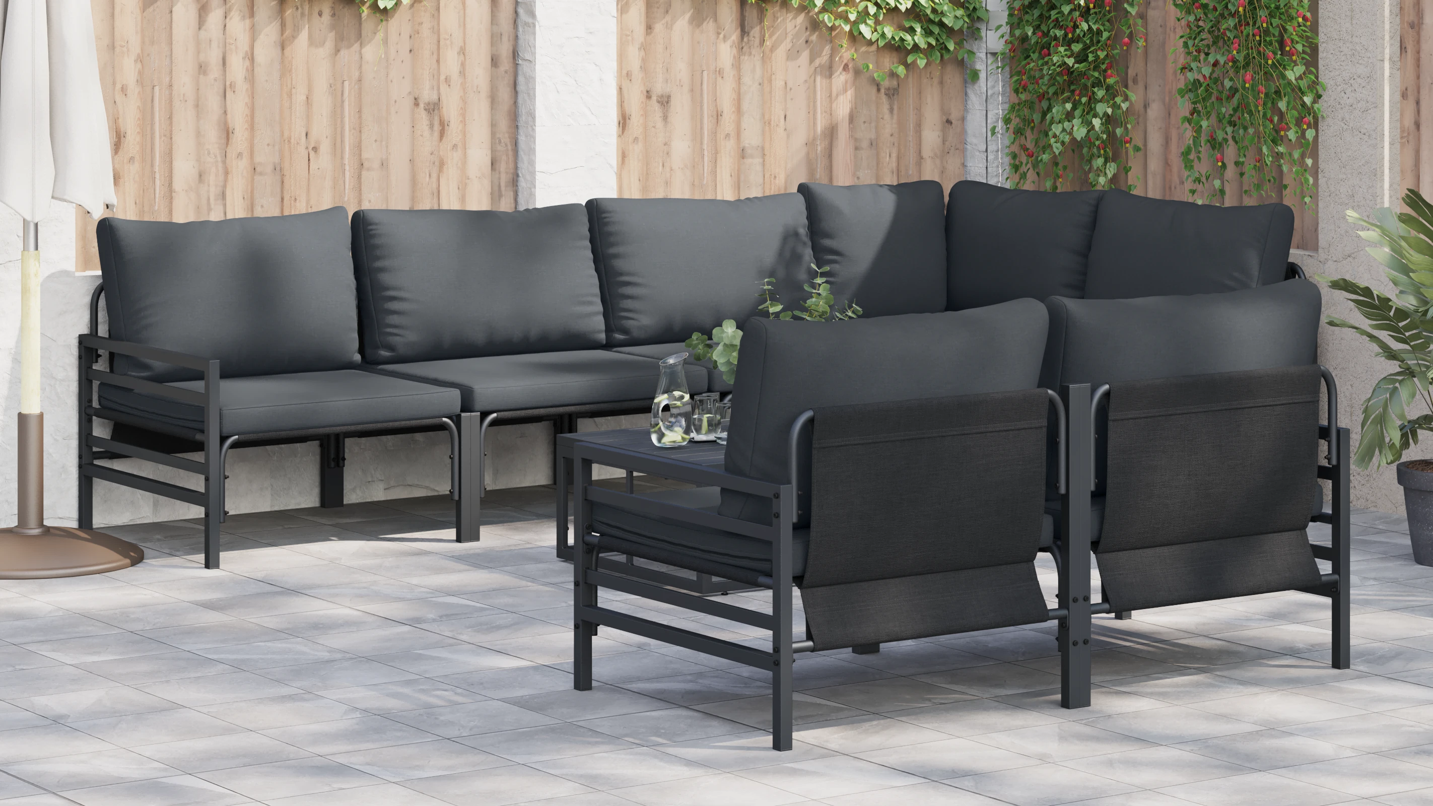 - Universalus išdėstymas: Šis komplektas susideda iš keturių sofačių su atlošais, vienos kampinės sofos ir dviejų vidurinių sofos, leidžiančių lanksčiai konfigūruoti skirtingoms lauko erdvėms. Ar ieškote kompaktiško sėdėjimo, ar erdvaus poilsio komplekto, modulinis dizainas puikiai pritaikomas skirtingiems išdėstymo poreikiams.