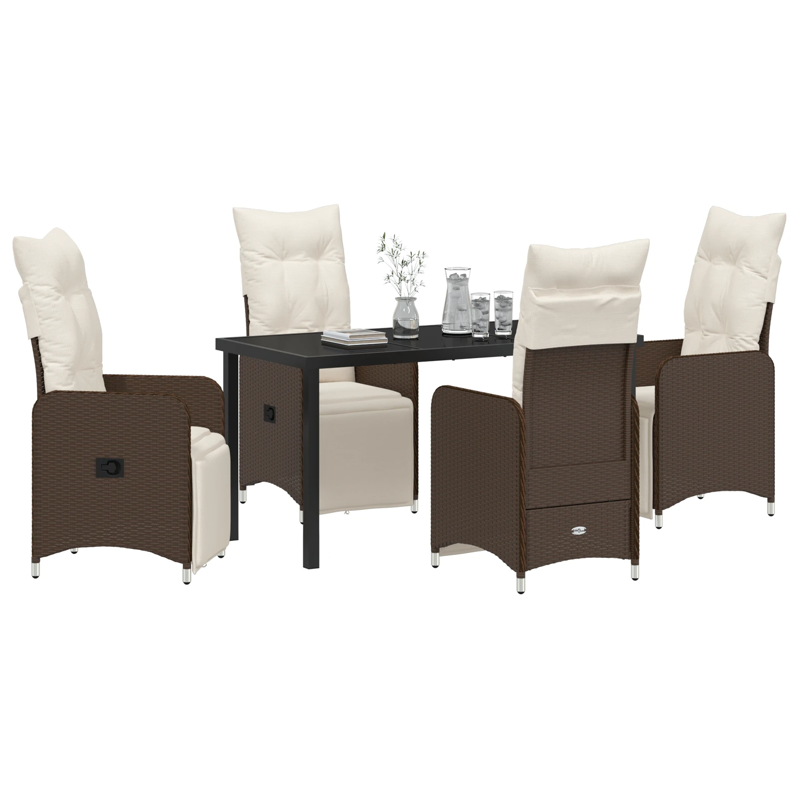 - Aukštos kokybės medžiagos: Pagamintas iš poliratanų, grūdinto stiklo ir milteliniu būdu dengto plieno, šis valgymo komplektas siūlo stiliaus ir atsparumo derinį. Poliratanas prideda modernumo ir užtikrina UV atsparumą, kuris garantuoja ilgalaikį patrauklumą ir funkcionalumą. Milteliniu būdu dengtas plienas suteikia tvirtą palaikymą, užtikrindamas, kad komplektas tarnaus ilgai net lauke.