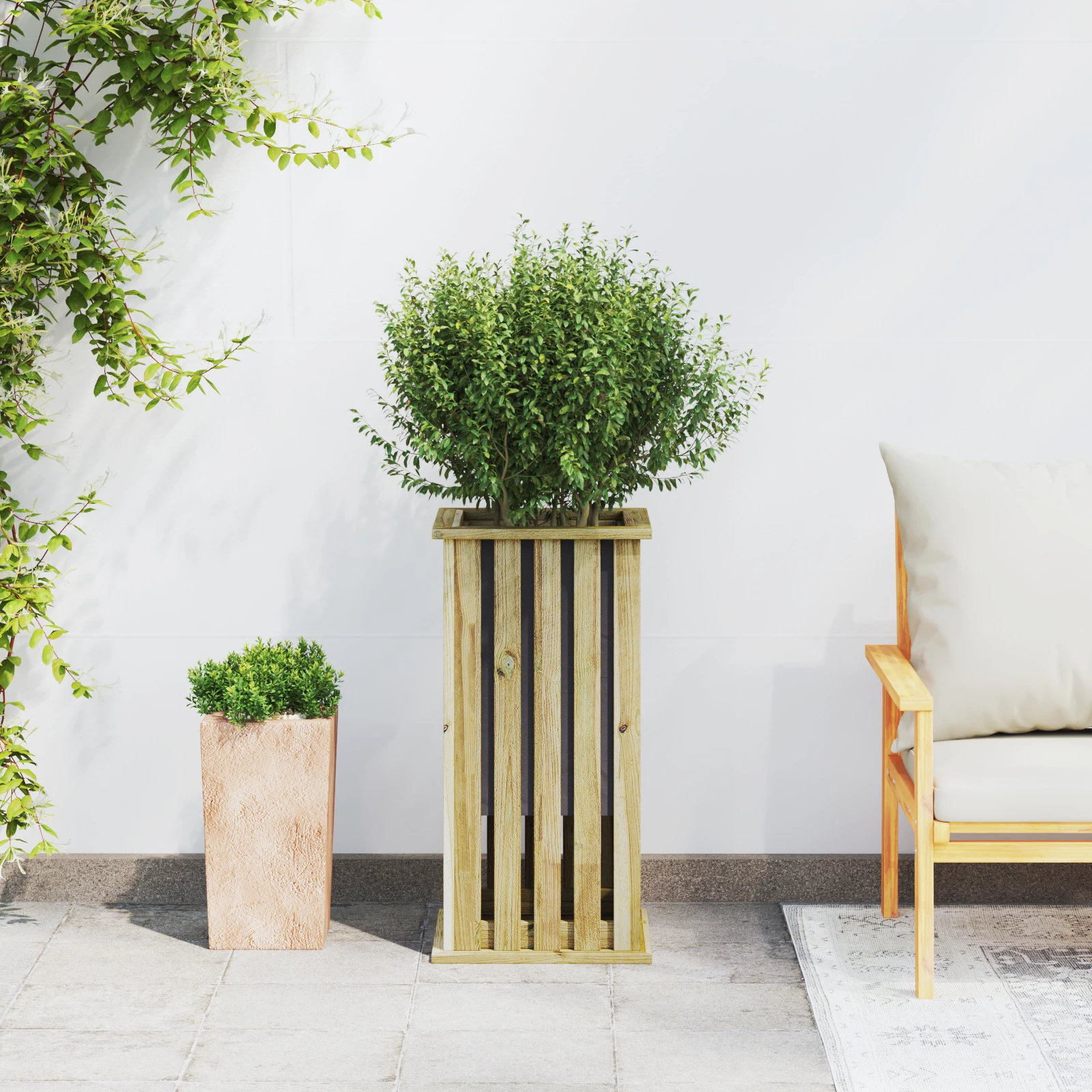 Čia yra vazonų rinkinys iš impregnuotos pušies, sukurtas, kad suteiktų rustikalaus žavesio bet kuriam namui ar sodui. Šie vazonai atneša estetinį grožį su savo natūralia išvaizda, tad puikiai tinka tiek vidaus, tiek išoriniam naudojimui. Jie talpina įvairių rūšių augalus, sukurdami sodrų ir gyvą vaizdą, kuris puikiai papuošia bet kurią erdvę.