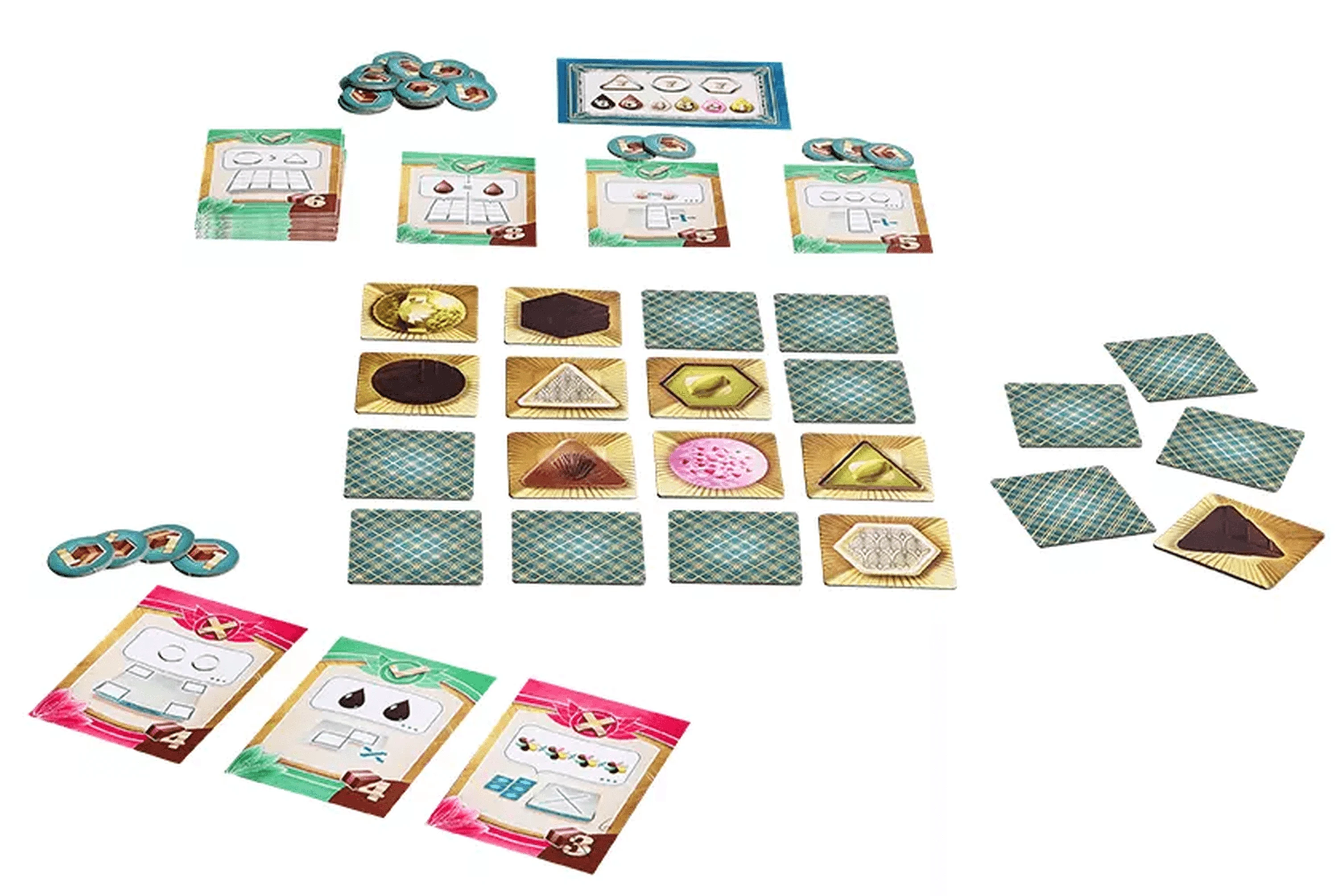 Žaidimo turinys: 21 „saldainiai“: 7 apvalūs, 7 trikampiai ir 7 šešiakampiai, suskirstyti į 6 rūšis: 6 juodi, 5 rudi, 4 balti, 3 žali, 2 rožiniai ir 1 auksinis, 24 „nugos“ kubeliai, 29 spėjimų kortelės, 1 kortelė su visais saldainiais, instrukcija.