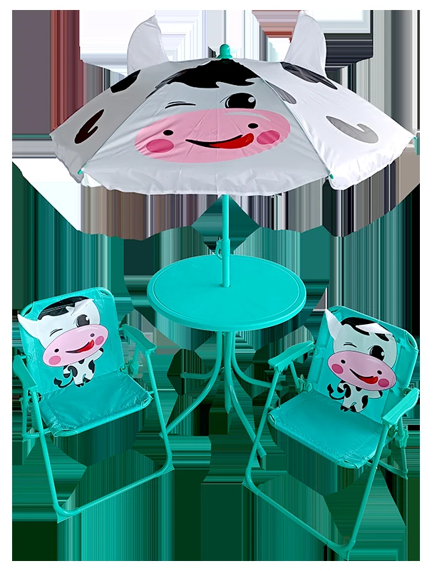 Dārza mēbeļu komplekts bērniem no 4 daļām zilā krāsā ar gotiņas dizainu. Komplektā ietilpst 2 krēsli, 1 saulessargs un 1 galds.