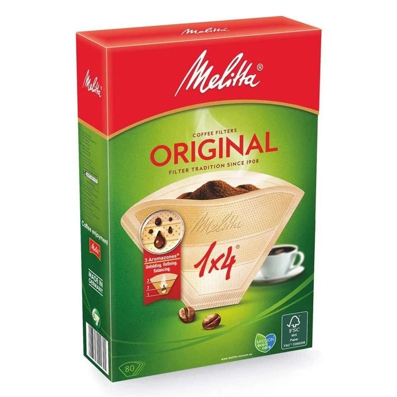 Zīmols- Melitta. Modelis- Original 1x4. Krāsa- Brūna. Materiāls- Papīrs. Skaits- 4. Vienību skaits iepakojumā- 80. Obligātā garantija- 24 mēn. Garantija juridiskām personām- 12 mēn.