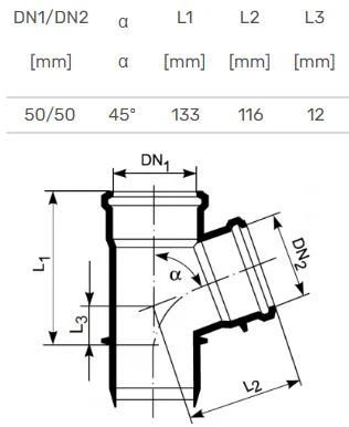 Vidaus kanalizacijos trišakis Ultra dB. DIA 50 - 50 mm. 45°