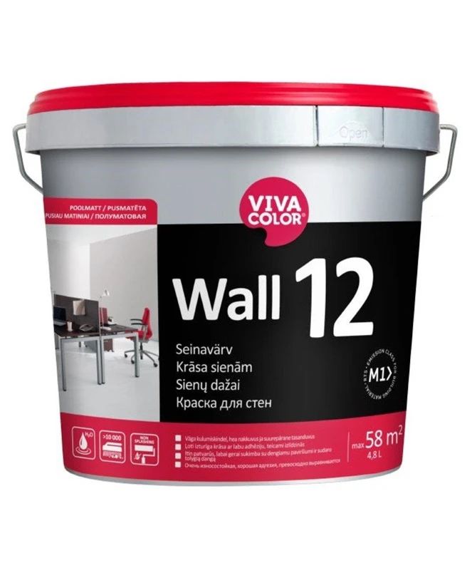 Zīmols- Vivacolor. Iepakojuma daudzums. l- 4.8. Krāsas tips- Emulsija. Krāsas tonis- Balta. Spīdums- Pus-matēts. Izturība pret mitro tīrīšanu- 1. izturības klase. Atšķaidītājs- Ūdens. Apdares darbiem- Iekštelpu . Krāsas funkcija- Sienas. Griesti. Piemērotās virsmas- Betons. Ģipškartons. Lakotas virsmas. Pārklātas virsmas. Ķieģeļu mūris. Žāvēšanas laiks pirms apstrādes- 2 - 2h.
