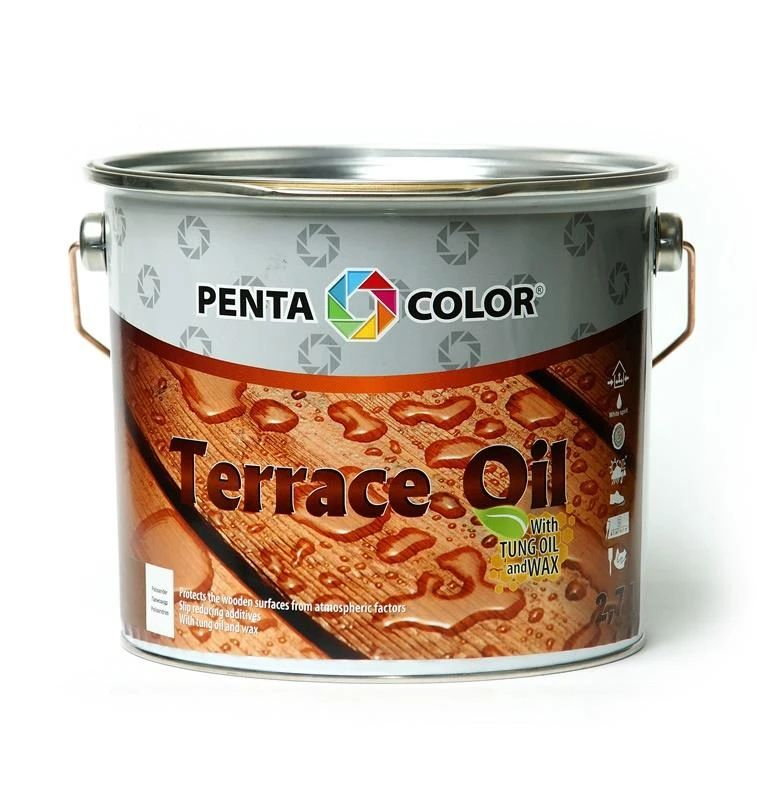 Prekės ženklas- Pentacolor. Skirta apdailos darbams- Lauko. Kiekis pakuotėje. l- 2.7. Skiediklis- Vaitspiritas. Spalva- Ruda. Išeiga- 9-11 m²/l. Savybės- Apsaugo apdorotą medieną nuo atmosfeos veiksnių poveikio ir teršalų. pagerina medinių paviršių atsparumą dėvėjimuisi. trukdo įsigerti vandeniui. Su tungo ir vaško priedais.. Visiškai išdžiūsta po- 12 - 12h. Džiūvimo laikas (prieš liečiant)- 10 - 12h.