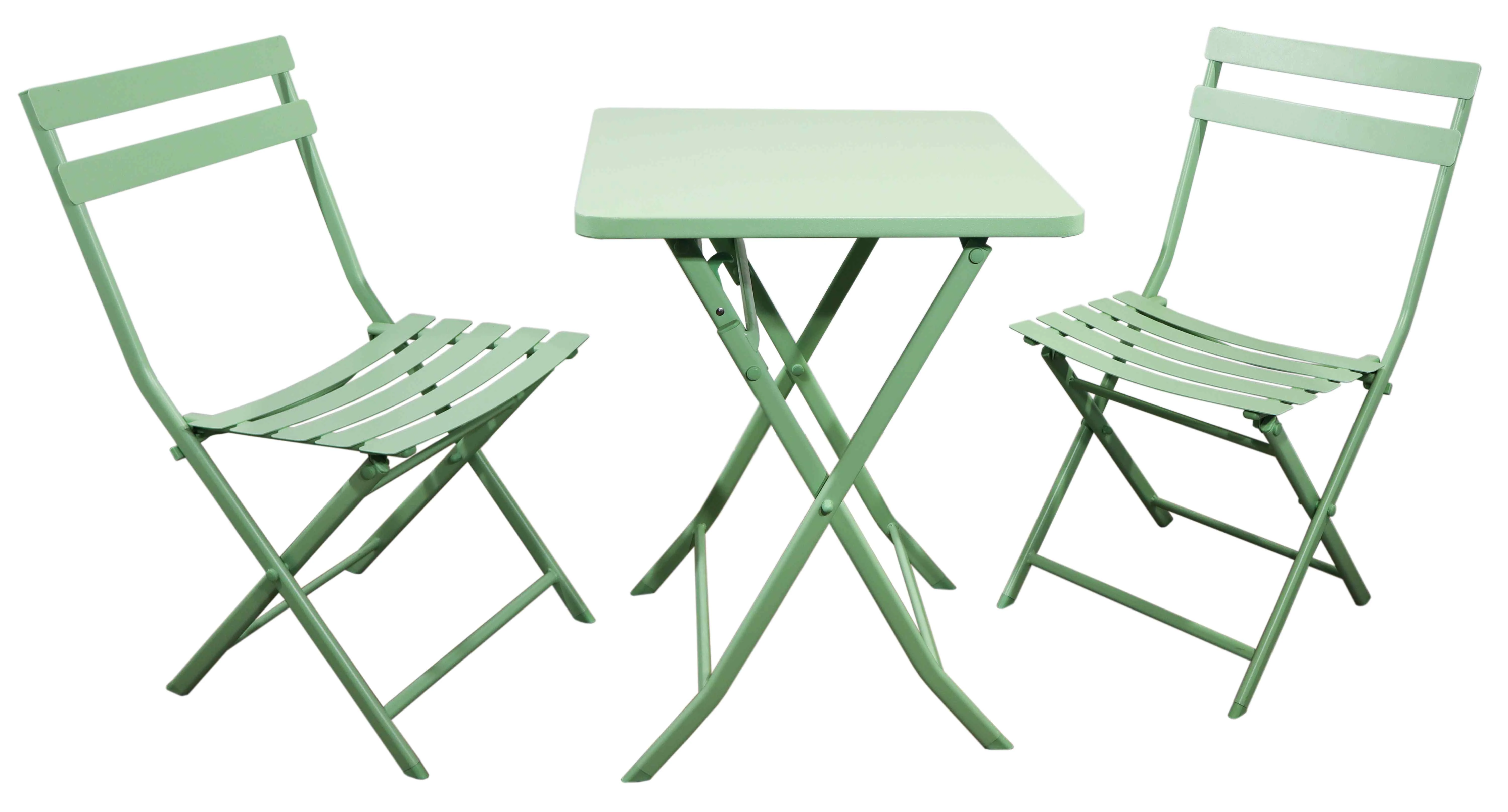 Metāla mēbeļu komplekts. Izgatavots no kvalitatīva pulverkrāsota tērauda. Komplektā ietilpst saliekams galds un 2 krēsli. Galda izmērs 55 x 55 x 70 cm, krēslu izmērs 42 x 50 x 80 cm.