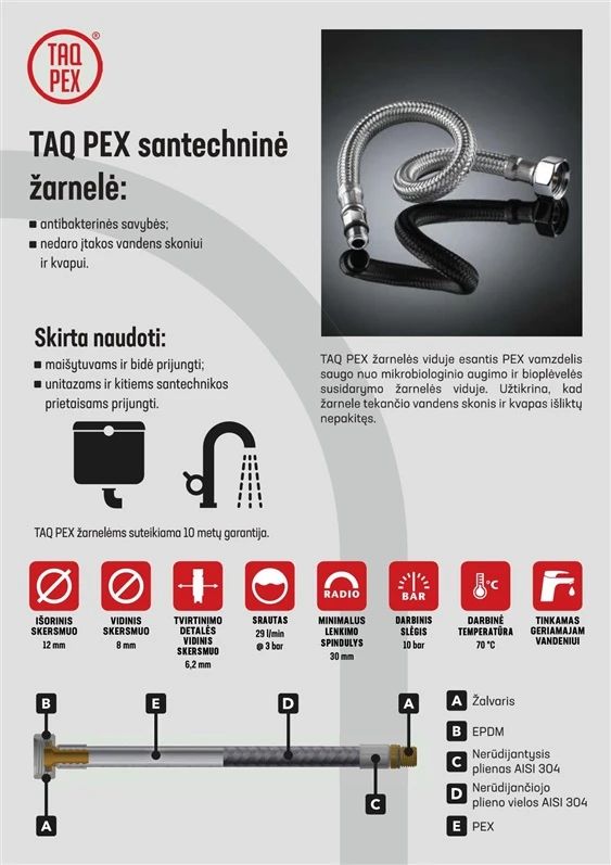 Zīmols- Tucai S.A.. Materiāls- Nerūsējošais tērauds. Polietilēns (PEX). Garums- 70 cm. Santehniskais savienojums. diametrs- M10 (37 mm). S1/2". Iekšējais diametrs- 8 mm. Ārējais diametrs- 12 mm. Darba temperatūra- 1 - 85°C. Darba spiediens- 10 Bar. Minimālais loka rādiuss- 30 mm. Ar elkoni- Nē. Obligātā garantija- 24 mēn. Papildus informācija- Garums: 70 cm. Savienojums: 1/2".