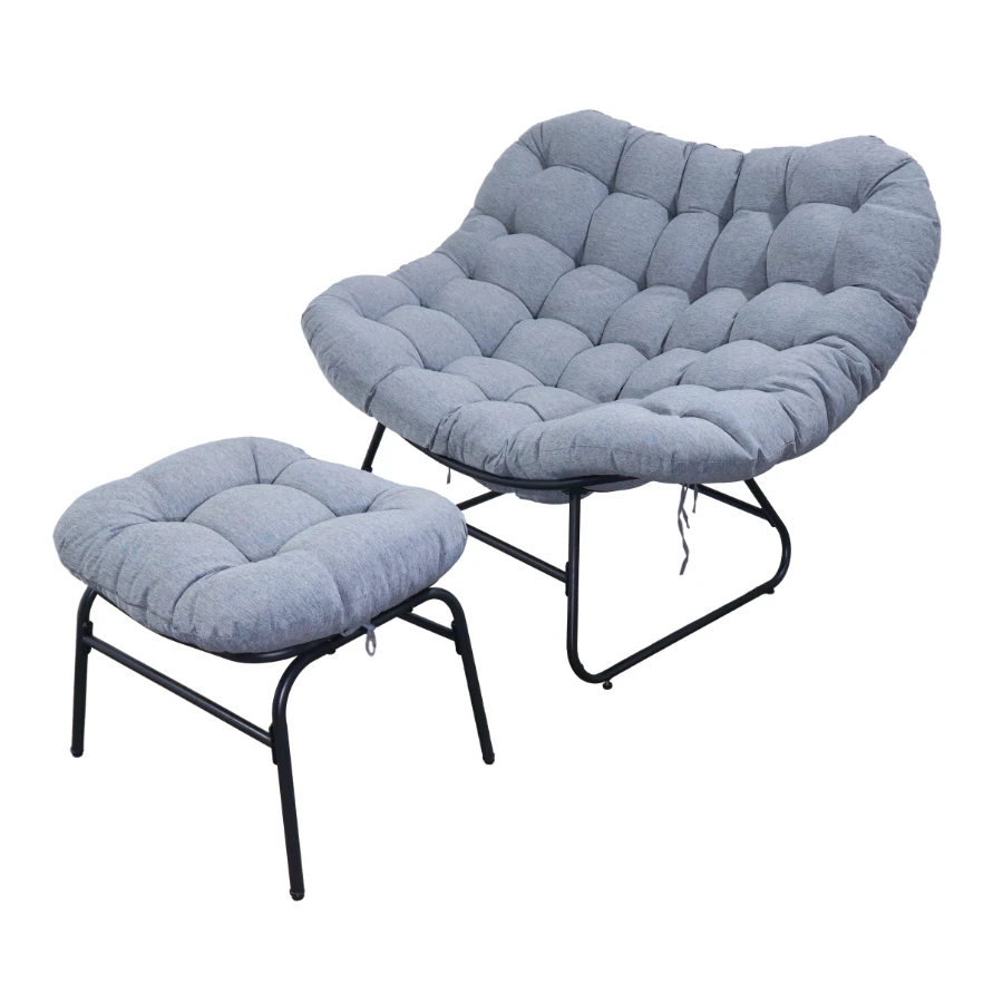 Poilsio kėdė su kojų atrama yra puikus pasirinkimas atsipalaiduoti sode ar terasoje. Kėdės rėmas pagamintas iš metalo, užtikrinantis stabilumą ir patvarumą, o storas ir minkštas paminkštinimas (17 cm storio sėdynės pagalvė ir 14 cm storio kojų atramos pagalvė) suteikia maksimalų komfortą. Audinys – aukštos kokybės poliesteris (220 g/m²), kuris yra atsparus ir lengvai prižiūrimas. Kėdės išmatavimai 115 x 103 x 90/52 cm, kojų atramos išmatavimai 60 x 52 x 50 cm.