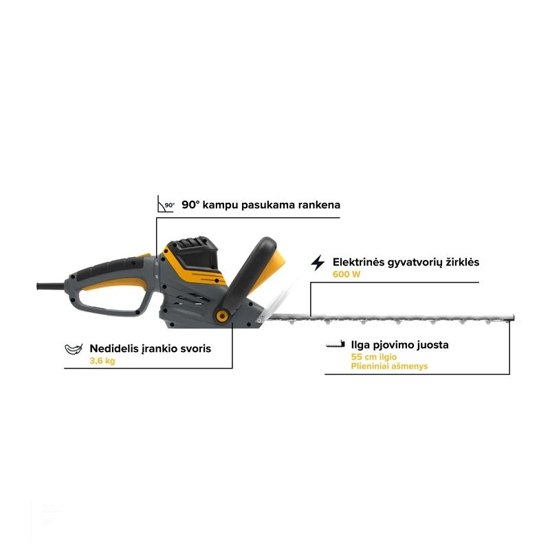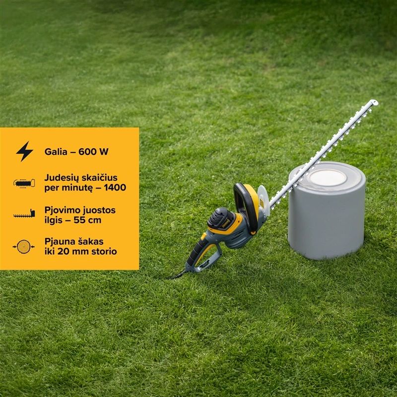 Prekės ženklas- Grunder. Artikulas- CYHT08B-550. Spalva- Mėlyna. Pilka. Galia- 600 W. Žirklių tipas- Elektrinės. Svoris- 3.6 kg. Pjovimo juostos ilgis- 55 cm. Atstumas tarp ašmenų- 20 mm. Judesių skaičius per minutę- 1400. Reguliuojama rankena- Ne. Peilio dėklas- Taip. Garantija- 36 mėn. Garantija juridiniams asmenims- 12 mėn. Papildoma informacija- Rankena pasukama 90° kampu. „Sk5“ – ilgaamžiai plieniniai ašmenys. Apsaugos nuo variklio perdegimo sistema.