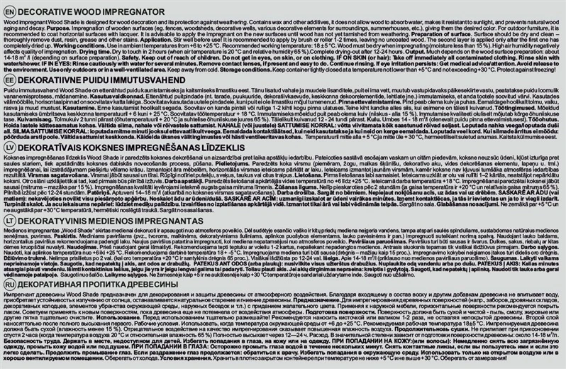 Prekės ženklas- Okko. Skirta apdailos darbams- Vidaus ir lauko. Kiekis pakuotėje. l- 1. Skiediklis- Vanduo. Spalva- Raudona. Išeiga- 14-18 m²/l. Savybės- Paviršius turi būti sausas ir švarus. Dulkes. sakus. riebalų ar kitas dėmes kruopščiai nuvalyti. Prieš naudojant gerai išmaišyti. Rekomenduojama tepti teptuku ar voleliu 1-2 kartus. nepaliekant nepadengtos medienos. Antrasis sluoksnis tepamas tik visiškai išdžiūvus pirmajam. Impregnuojama mediena turi būti sausa (drėgnis- mažiau kaip 15 proc.).. Visiškai išdžiūsta po- 12 - 24h. Džiūvimo laikas (prieš liečiant)- 2 - 2h.
