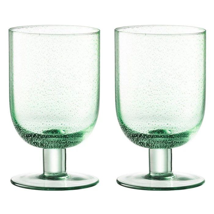 Stiklinės taurės su lengvais oro burbuliukais; šviesiai žalios (šalavijų) spalvos; talpa 35 cl; tinkamos vynui, vandeniui ir gėrimams; galima plauti indaplovėje.