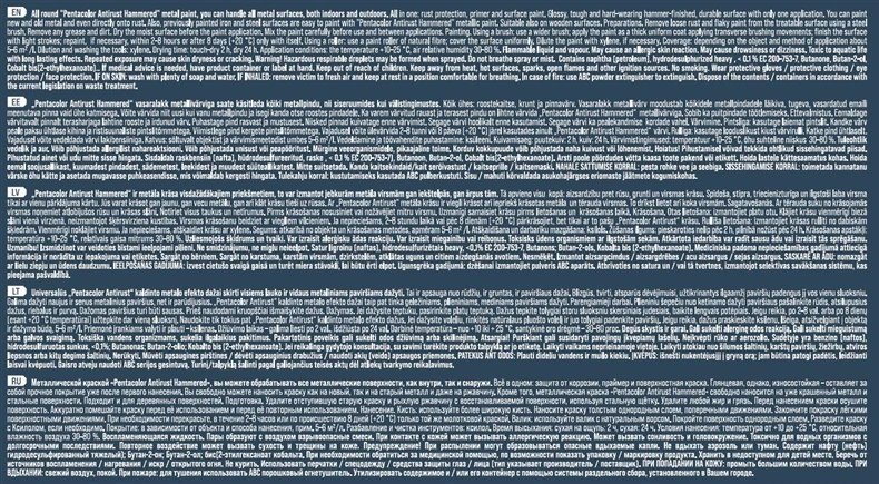 Prekės ženklas- Pentacolor. Kiekis pakuotėje. l- 2.5. Dažų tipas- Specialios paskirties dažai. Emalio tipas- Antikorozinis. Dažų spalva- Sidabro. Blizgumas- Blizgus. Skiediklis- Ksilenas. Skirta apdailos darbams- Vidaus ir lauko. Dažų paskirtis- Universalūs. Išeiga- 5-6 m²/l. Darbo įrankiai- Volelis. Purkštukas. Teptukas. Tinka karščio veikiamiems paviršiams- Ne. Džiūvimo laikas (prieš liečiant)- 2 - 2h. Visiškai išdžiūsta po- 24 - 24h. Papildoma informacija- Dažų tipas: emalis. Emalio tipas: antikorozinis. Tinka karštiems paviršiams: ne.