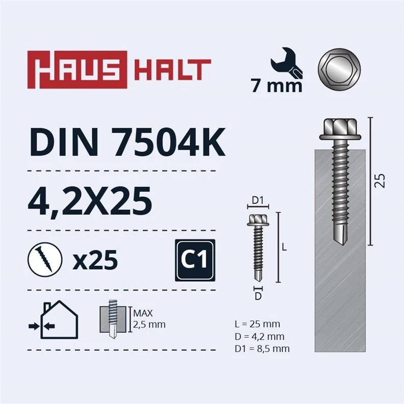 Prekės ženklas- Haushalt. Savisriegių tipas- Su grąžteliu . Ilgis- 25 mm. Skersmuo- 4.2 mm. Padengimas- Cinkuota. Tvirtinama medžiaga- Metalas. Standartas- DIN 7504K. Vienetai pakuotėje- 25.
