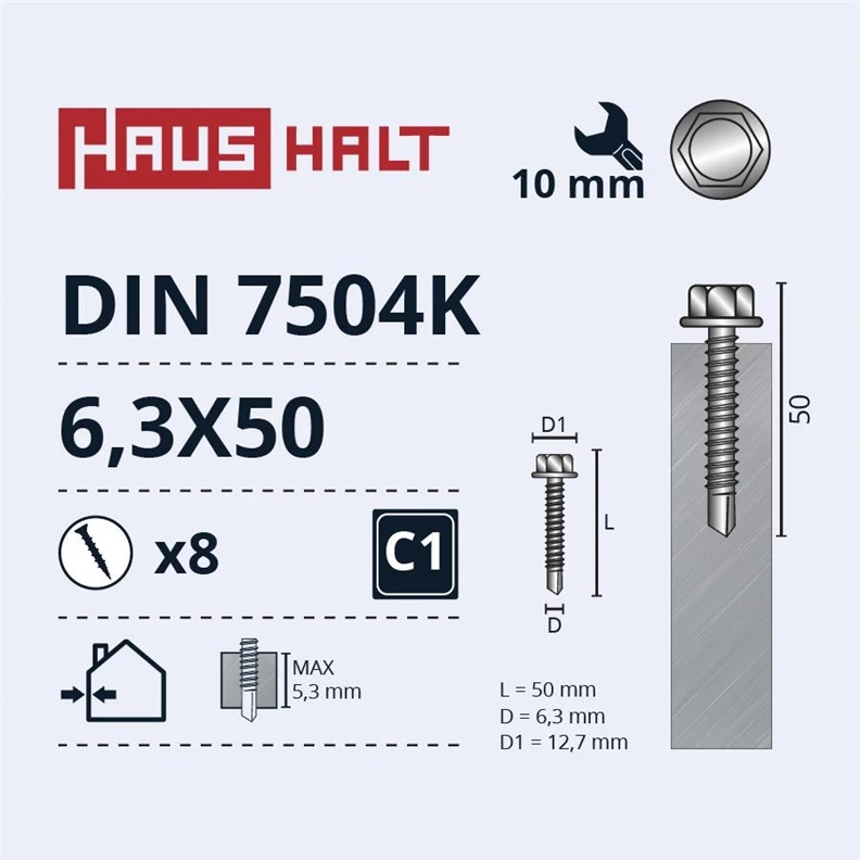 Prekės ženklas- Haushalt. Savisriegių tipas- Su grąžteliu . Ilgis- 50 mm. Skersmuo- 6.3 mm. Padengimas- Cinkuota. Tvirtinama medžiaga- Metalas. Standartas- DIN 7504K. Vienetai pakuotėje- 8. Papildoma informacija- Danga: cinkuotas. Gaminio tipas: savisriegiai varžtai. Savisriegių varžtų tipas: su grąžtu. Standartas: DIN 7504K. Tvirtinimo medžiaga: metalas.